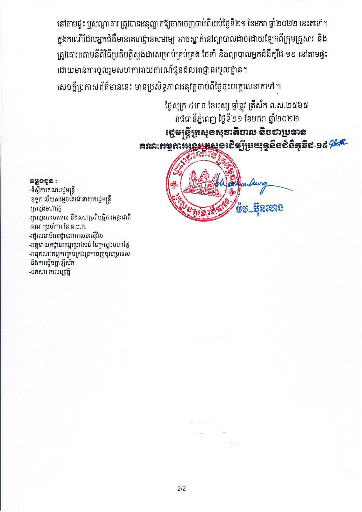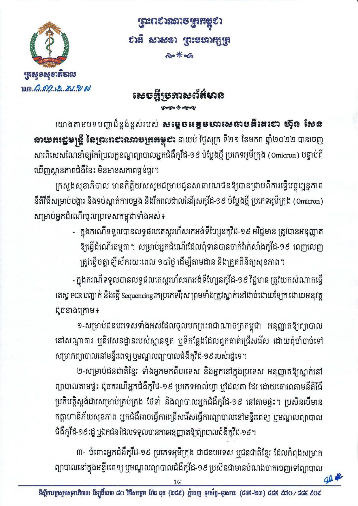 ក្រសួងសុខាភិបាល មានកិត្តិយសសូមជម្រាបជូនសាធារណជន ឲ្យបានជ្រាបពីការធ្វើបច្ចុប្បន្នភាពនីតិវីធីសម្រាប់បង្ការ និងទប់ស្កាត់ការចម្លង និងរីករាលដាលនៃវីរុសកូវីដ១៩ បំប្លែងថ្មី ប្រភេទអូមីក្រុង (Omicron) សម្រាប់អ្នកដំណើរចូលប្រទេសកម្ពុជាទាំងអស់៖