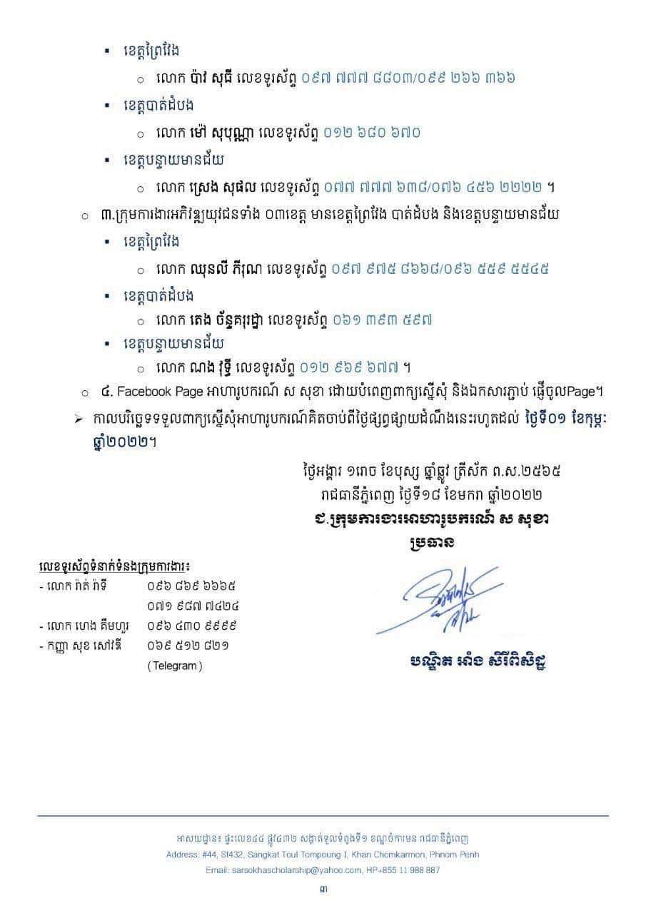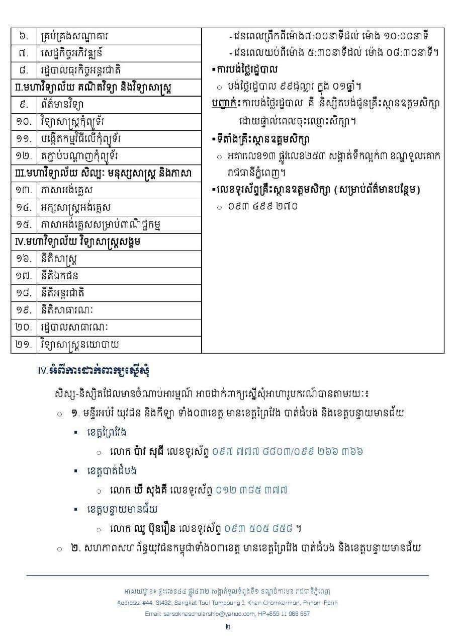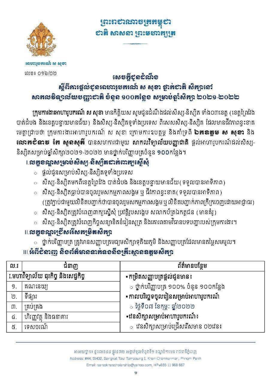 ដោយក្រុមការងារអាហារូបករណ៍ ស សុខា សូមជូនដំណឹងដល់សិស្ស-និស្សិត ទាំង ០៣ខេត្ត (ព្រៃវែង បាត់ដំបង បន្ទាយមានជ័យ) និងសិស្ស-និស្សិតទូរទាំងប្រទេស ពិសេសសិស្ស-និស្សិត ដែលមានជីវភាពខ្វះខាតមេត្តាជ្រាបថា៖ ក្រោមការឧបត្ថម្ភ និងគាំទ្រពី ឯកឧត្តម ស សុខា និងលោកជំទាវ កែ សួនសុភី បានសហការជាមួយ សាកលវិទ្យាល័យបញ្ញាជាតិ ផ្ដល់អាហារូបករណ៍ដល់សិស្ស-និស្សិតសម្រាប់ឆ្នាំ២០២១-២០២២ មានថ្នាក់បរិញ្ញាបត្រចំនួន ១០០កន្លែង ទីតាំងសាកលវិទ្យាល័យ ស្ថិតនៅអគារលេខ១៣ ផ្លូវលេខ២៥៣ សង្កាត់ទឹកល្អក់៣ ខណ្ឌទួលគោក រាជធានីភ្នំពេញ ចាប់ផ្តើមទទួលពាក្យពីថ្ងៃផ្សាយដំណឹងនេះ រហូតដល់ថ្ងៃទី០១ ខែកុម្ភៈ ចូលរៀនថ្ងៃទី០៧ ខែកុម្ភៈ ឆ្នាំ២០២២ ៕