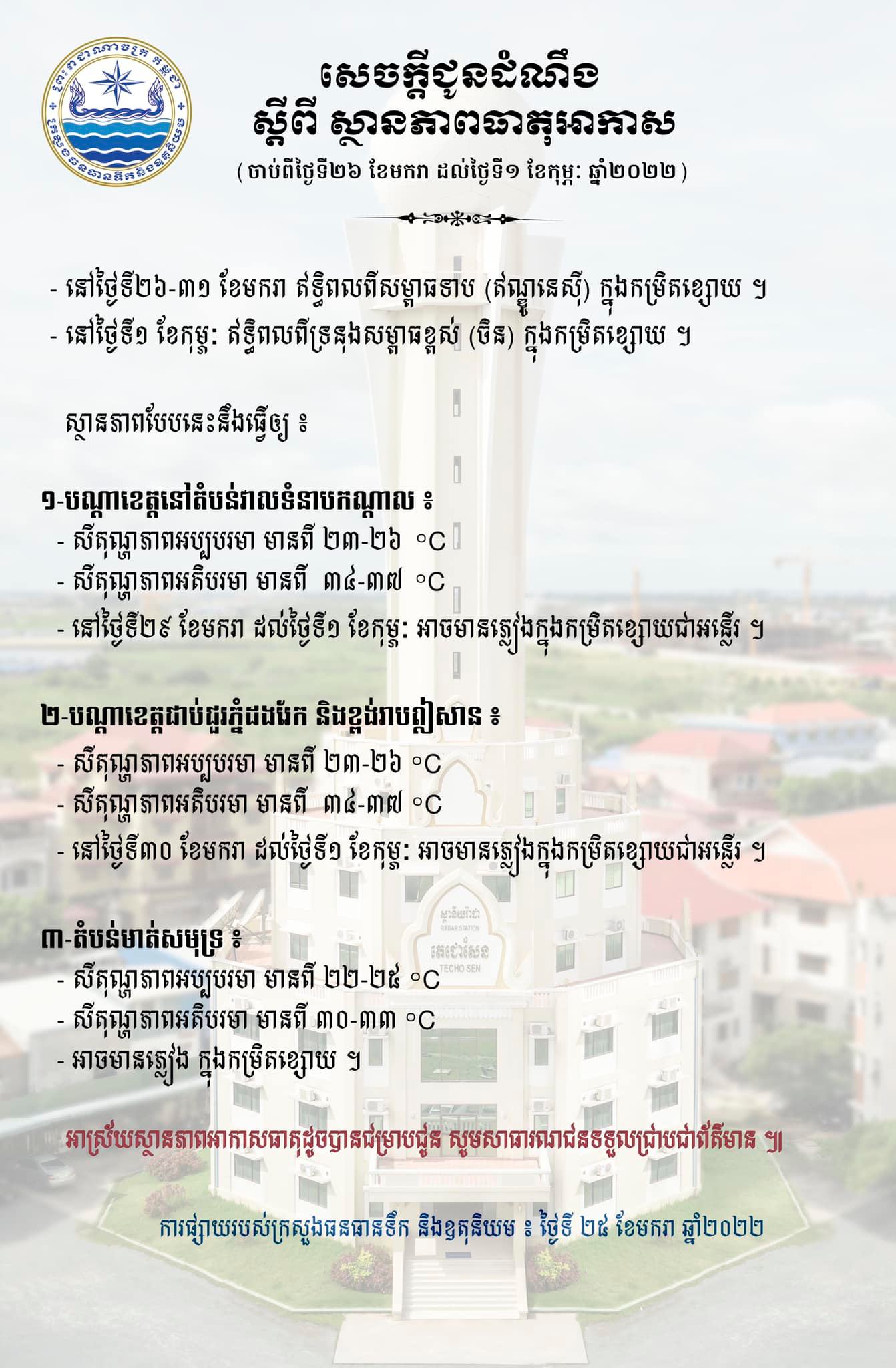 រាជធានីភ្នំពេញ៖ យោងតាមការចុះផ្សាយរបស់ ក្រសួងធនធានទឹក និងឧតុនិយម នៅថ្ងៃទី២៥ ខែមករា ឆ្នាំ២០២២ បានចេញសេចក្ដីជូនដំណឹង ស្ដីពីស្ថានភាពអាកាសធាតុចាប់ពីថ្ងៃទី២៦ ខែមករា ដល់ថ្ងៃទី០១ ខែកុម្ភៈ ឆ្នាំ២០២២ បានឲ្យដឹងថា៖