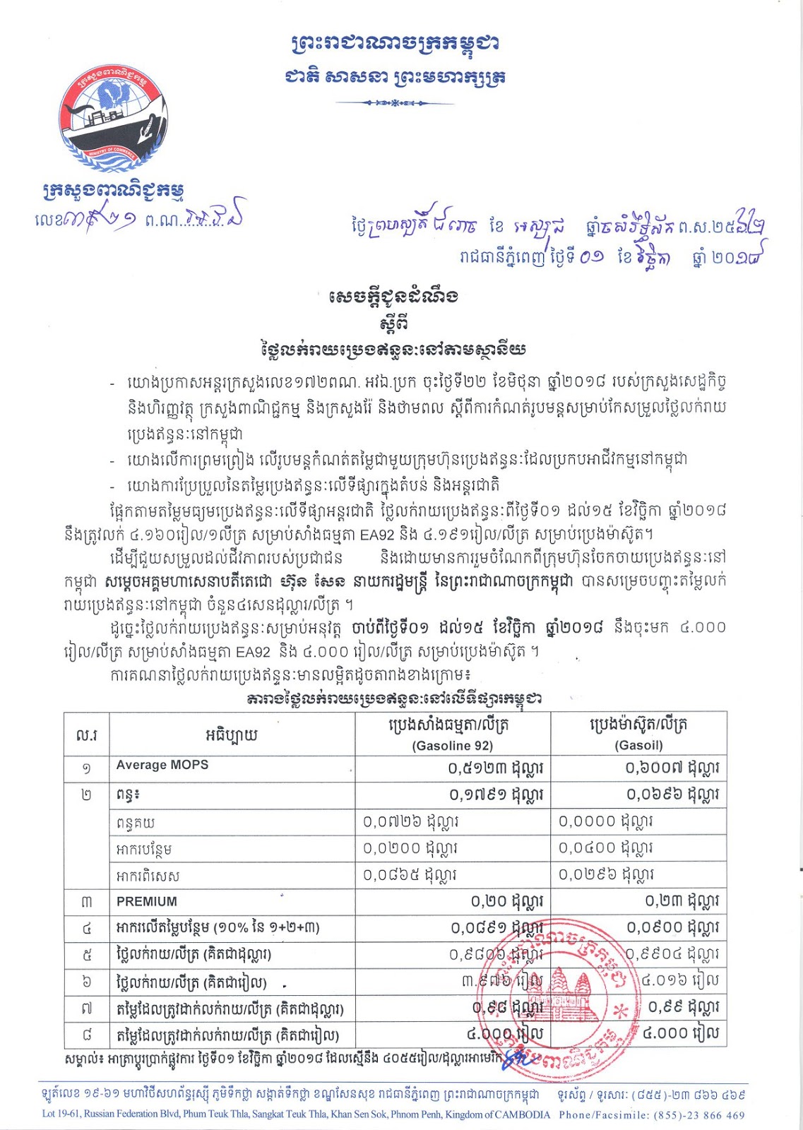 រាជធានីភ្នំពេញ៖ យោងតាមលិខិតរបស់ក្រសួងពាណិជ្ជកម្ម ចុះផ្សាយថ្ងៃទី០១ ខែវិច្ឆិកា ឆ្នាំ២០១៨ ស្តីអំពីតម្លៃលក់រាយប្រេងឥន្ធនៈនៅតាមស្ថានីយទាំងអស់ក្នុងព្រះរាជាណាចក្រកម្ពុជាសម្រាប់អនុវត្តចាប់ពីថ្ងៃទី០១ ដល់ថ្ងៃទី១៥ ខែវិច្ឆិកា ឆ្នាំ២០១៨ បានឲ្យដឹងថា ប្រេងសាំងធម្មតាក្នុងមួយលីត្រមានតម្លៃ ៤,០០០រៀល ចំណែកឯប្រេងម៉ាស៊ូតវិញមានតម្លៃស្មើរសាំងធម្មតាដែរ គឺ៤,០០០រៀលក្នុងមួយលីត្រដែរ ហើយតម្លៃនេះមានការធ្លាក់ចុះបើធៀបនឹងតម្លៃ ដែលក្រសួងបានកំណត់កាលពី១៥ថ្ងៃមុន ដែលប្រេងសាំងធម្មតាក្នុងមួយលីត្រតម្លៃ៤,២៥០រៀល និងប្រេងម៉ាស៊ូតក្នុងមួយលីត្រម្លៃ ៤,១៥០រៀល៕