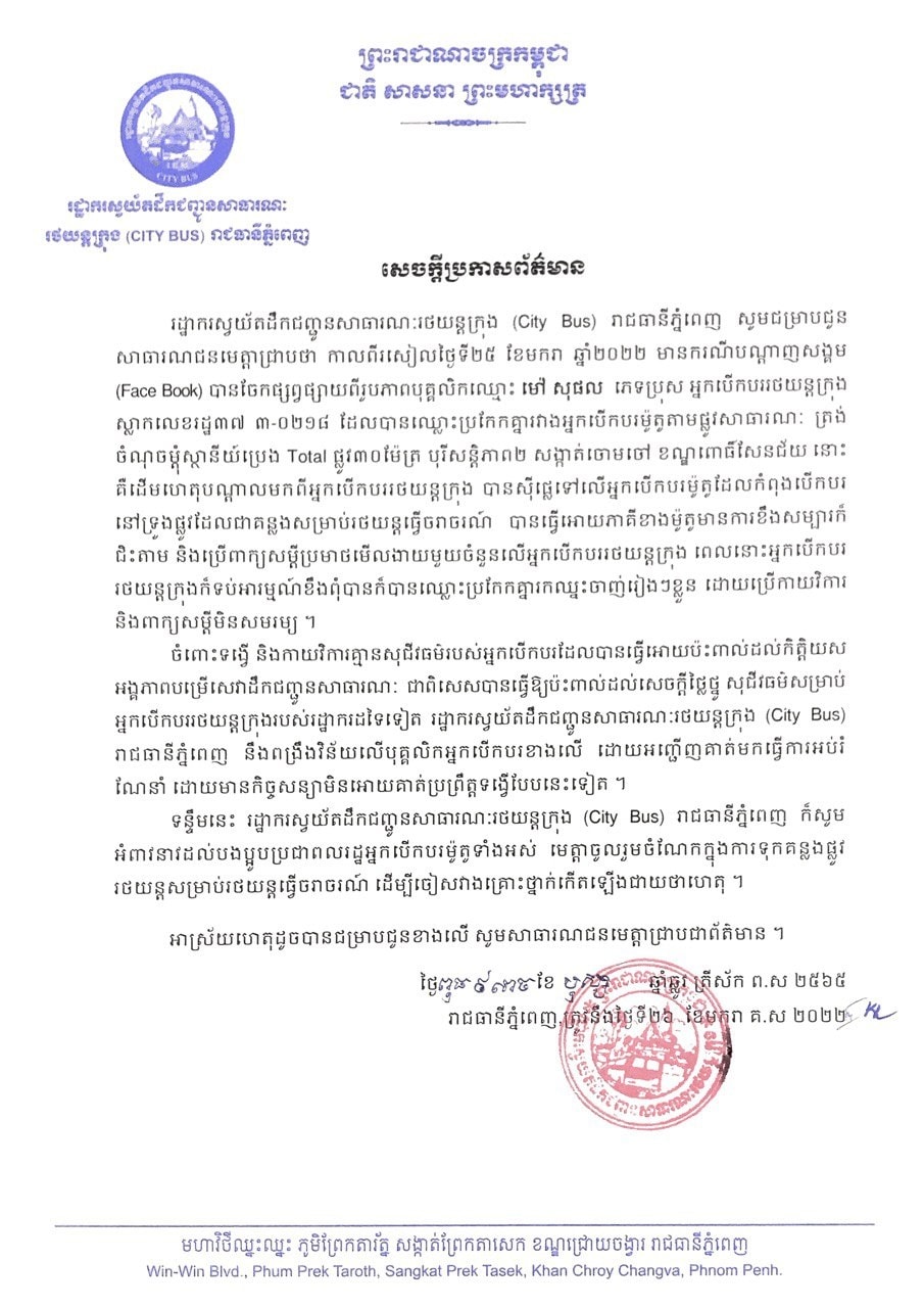 រាជធានីភ្នំពេញ៖ យោងតាមការចុះផ្សាយរបស់ រដ្ឋាករស្វយ័តដឹកជញ្ជូនសាធារណៈ រថយន្តក្រុង(CITY BUS) រាជធានីភ្នំពេញ នៅថ្ងៃទី២៦ ខែមករា ឆ្នាំ២០២២ បានចេញសេចក្ដីព័ត៌មាន រដ្ឋាករស្វយ័តដឹកជញ្ជូនសាធារណៈ សូមជម្រាបជូនសាធារណជនមេត្តាជ្រាបថា៖