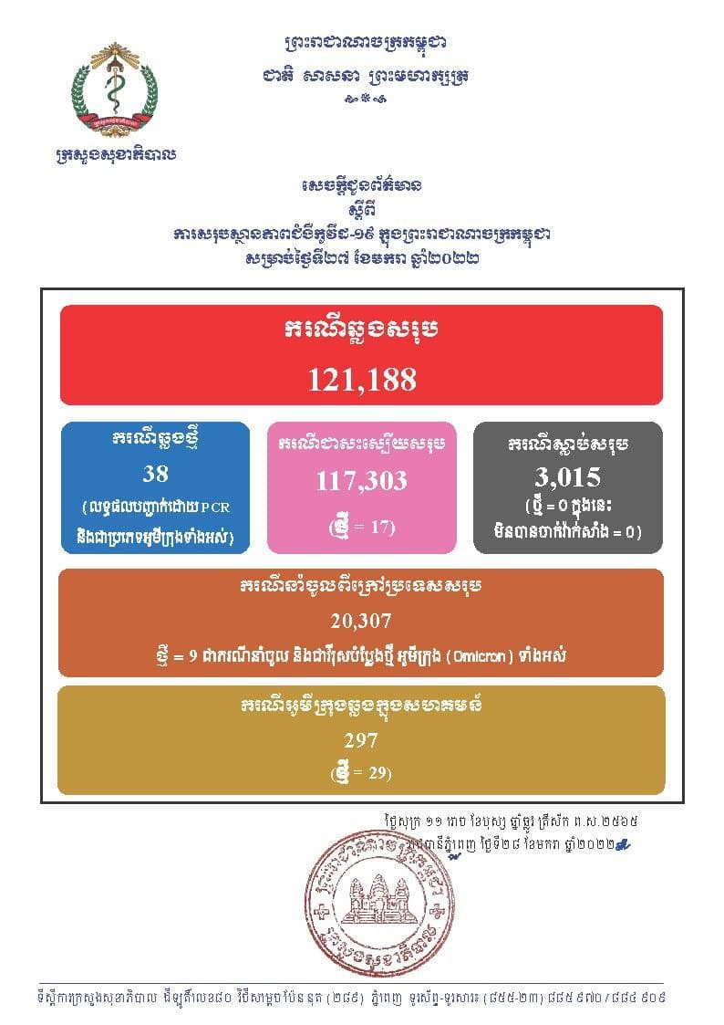 នៅថ្ងៃទី28 ខែមករា ឆ្នាំ2022នេះ ក្រសួងសុខាភិបាលកម្ពុជា បានចេញសេចក្តីជូនដំណឹងពី ការរកឃើញករណីវិជ្ជមានវីរុសកូវីដ១៩ថ្មី ចំនួន 38នាក់ (លទ្ធផលបញ្ជាក់ដោយ PCR នឹងជាប្រភេទអូមីក្រុងទាំងអស់) ក្នុងនោះករណីឆ្លងសហគមន៍ 29នាក់ និងករណីនាំចូល 9នាក់ ខណៈអ្នកបានជាសះស្បើយថ្មីមានចំនួន 19នាក់ និងមិនមានអ្នកបាត់បង់ជីវិតថ្មីនោះទេគិតមកទល់ពេលនេះ ករណីឆ្លងកូវីដ១៩ សរុបនៅក្នុងប្រទេសកម្ពុជា មានចំនួន 121,188នាក់, ករណីជាសះស្បើយសរុប 117,303នាក់ និងស្លាប់សរុប 3,015នាក់៕