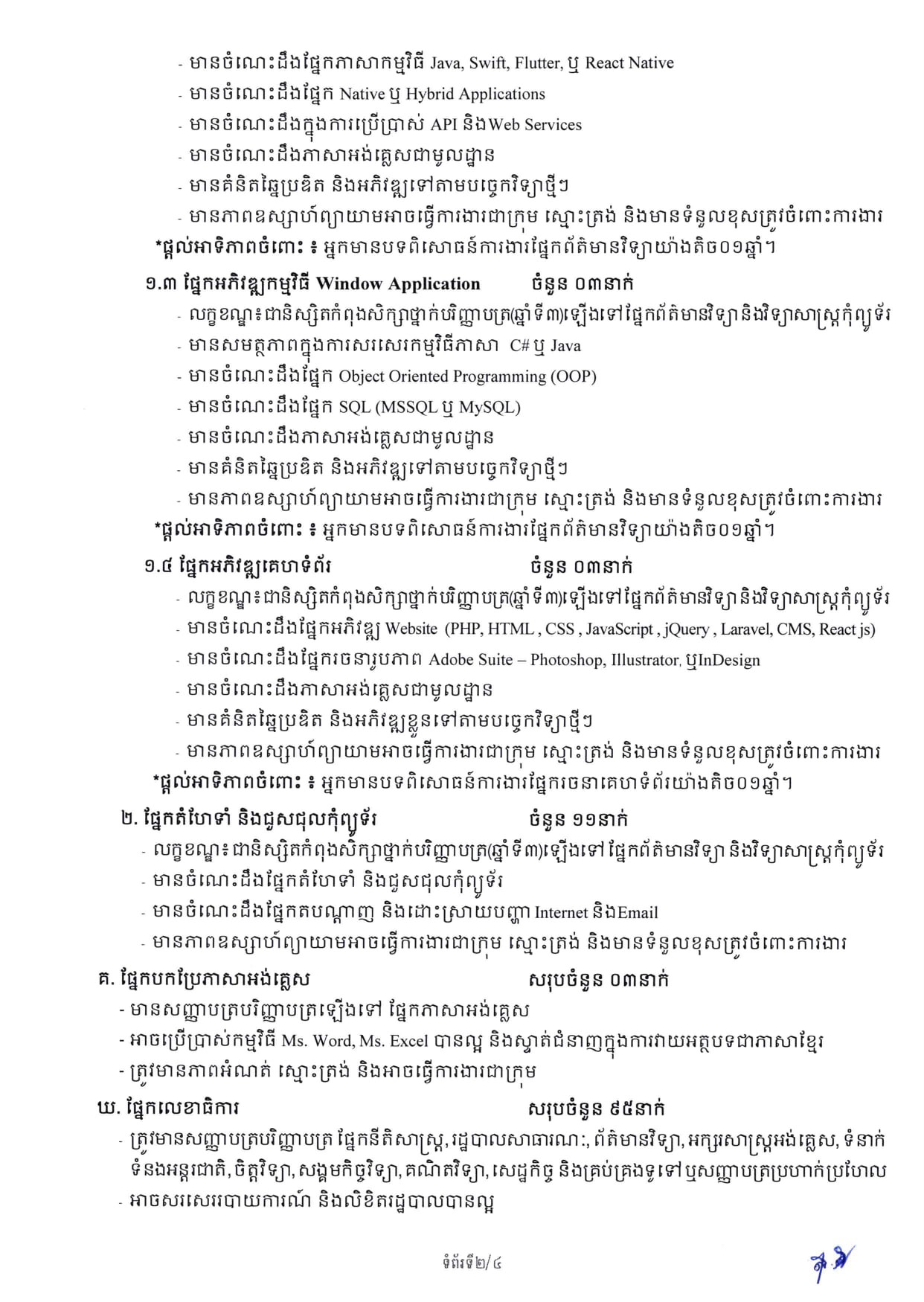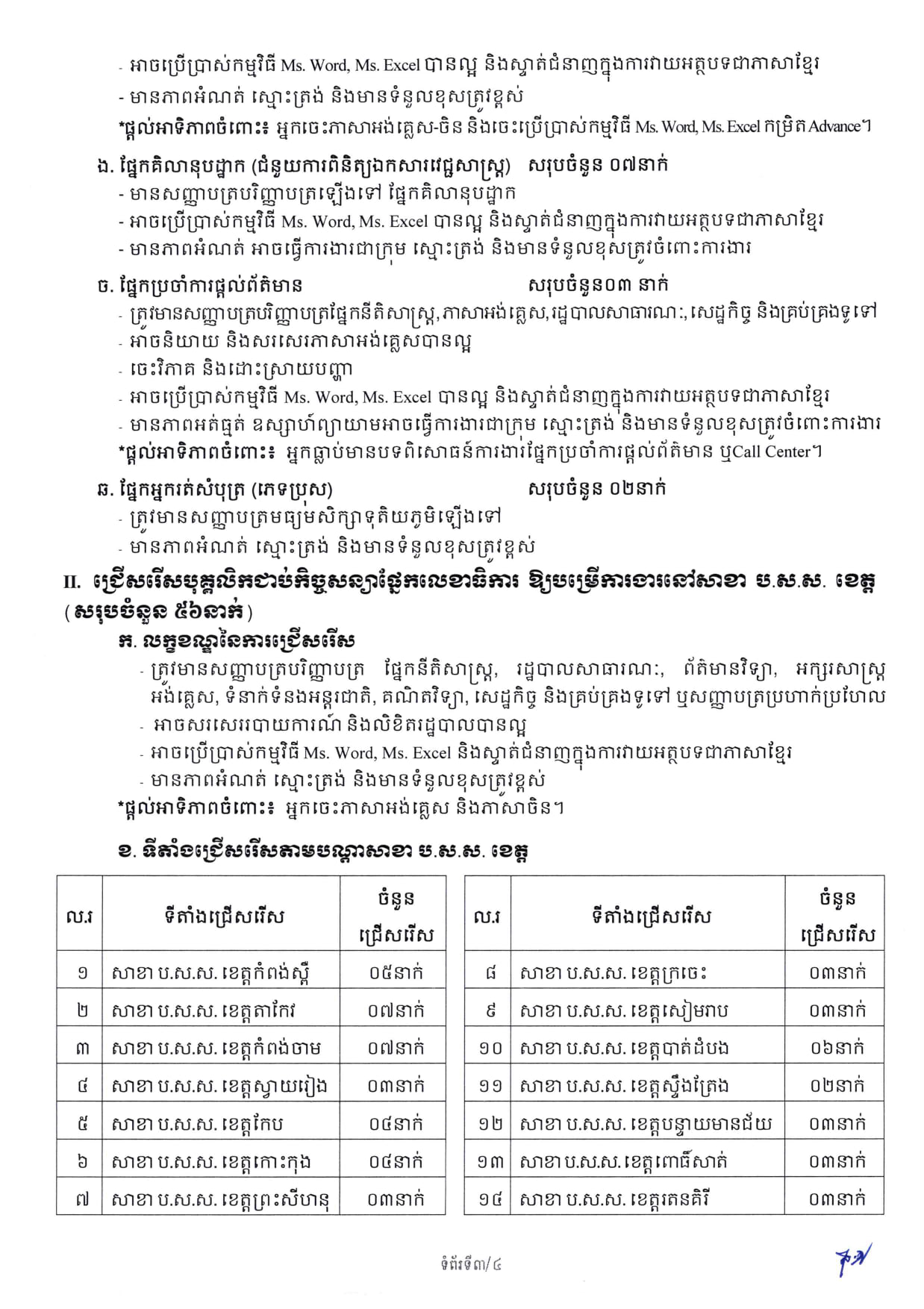 បេឡាជាតិសន្តិសុខសង្គម ហៅកាត់ ប.ស.ស គឺគ្រឹះស្ថានសាធារណៈរដ្ឋបាល ដែលមានភារកិច្ចគ្រប់គ្រង និងចាត់ចែងផ្នែកទាំងអស់នៃរបបសន្តិសុខសង្គម។ គ្រឹះស្ថាន ត្រូវការជ្រើសរើសបុគ្គលិកជាប់កិច្ចសន្យាសរុបចំនួន ២០៨នាក់ ឲ្យបម្រើការងារនៅស្នាក់ការកណ្ដាលចំនួន ១៥២នាក់ និងបណ្ដាសាខាប.ស.ស ខេត្តចំនួន ៥៦នាក់។ បេក្ខជន-បេក្ខនារី ត្រូវមានអាយុចាប់ពី ១៨ឆ្នាំ រហូតដល់ ៤០ឆ្នាំ គិតត្រឹមថ្ងៃឈប់ទទួលពាក្យ និងពុំមានឈ្មោះបម្រើការងារក្នុងក្របខណ្ឌរដ្ឋ (ជនពិការត្រូវបានលើកទឹកចិត្ត) ។ សូមទាញយកពាក្យស្នើសុំចុះឈ្មោះប្រឡងតាមរយៈតំណរភ្ជាប់នេះ https://drive.google.com/…/1QR5dnWJCWLsG3k3mQ…