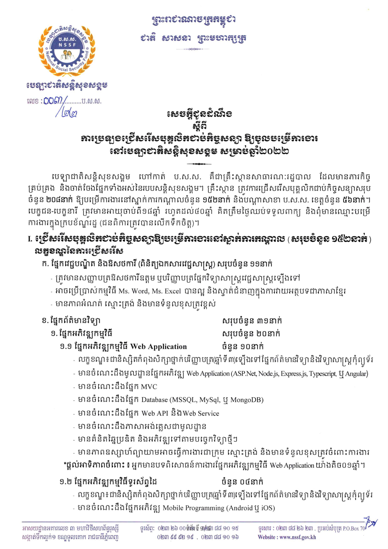 បេឡាជាតិសន្តិសុខសង្គម ប្រកាសប្រឡងជ្រើសរើសបុគ្គលិកជាប់កិច្ចសន្យាឲ្យចូលបម្រើការងារនៅបេឡាជាតិចំនួន ២០៨នាក់ សម្រាប់ឆ្នាំ២០២២