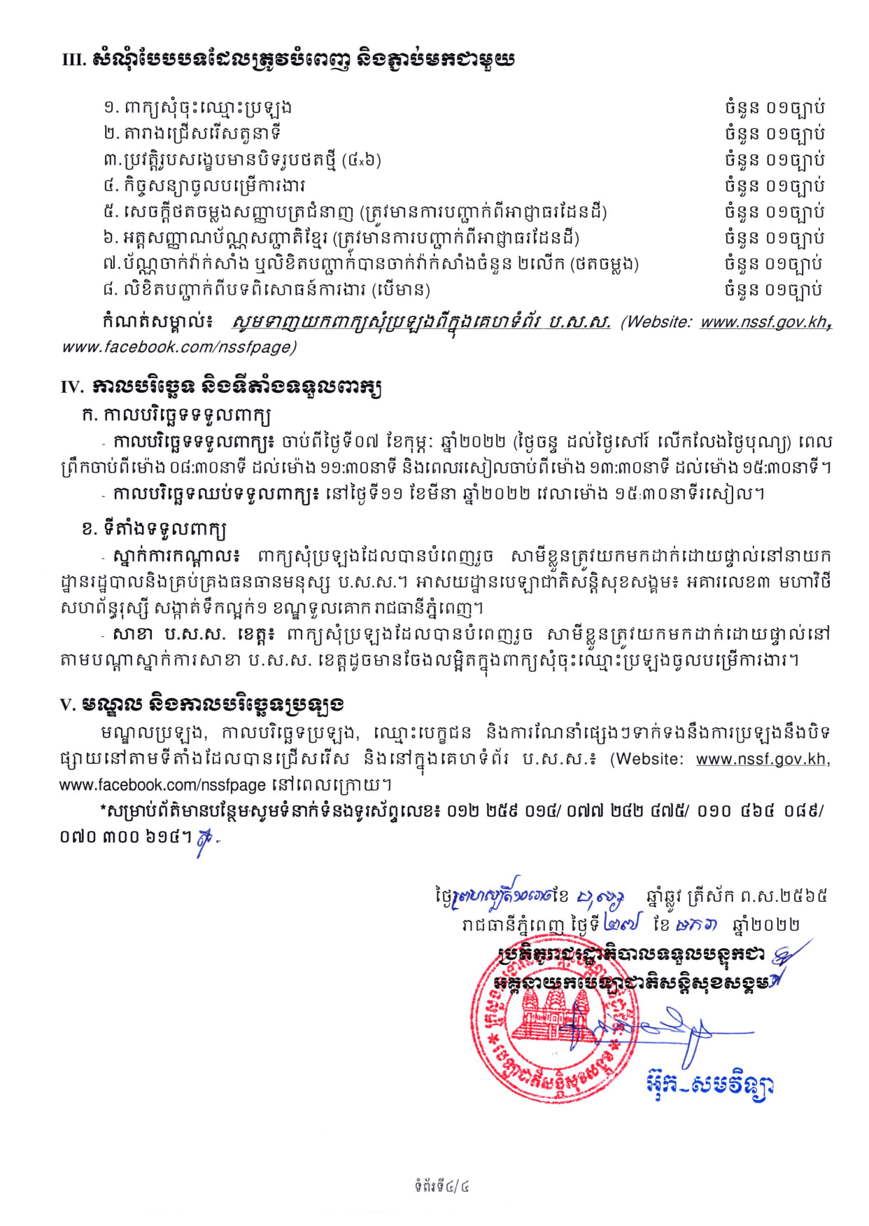 រាជធានីភ្នំពេញ៖ យោងតាមការចុះផ្សាយរបស់ បេឡាជាតិសន្តិសុខសង្គម នៅថ្ងៃទី២៨ ខែមករា ឆ្នាំ២០២២ បានចេញសេចក្តីជូនដំណឹង ស្តីពី ការប្រឡងជ្រើសរើសបុគ្គលិកជាប់កិច្ចសន្យា ឲ្យចូលបម្រើការងារនៅបេឡាជាតិសន្តិសុខសង្គម (ប.ស.ស.) សម្រាប់ឆ្នាំ២០២២ ។