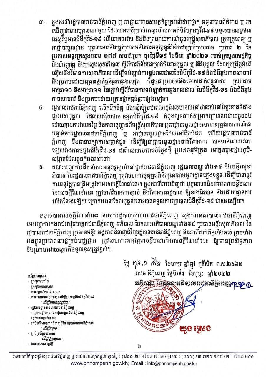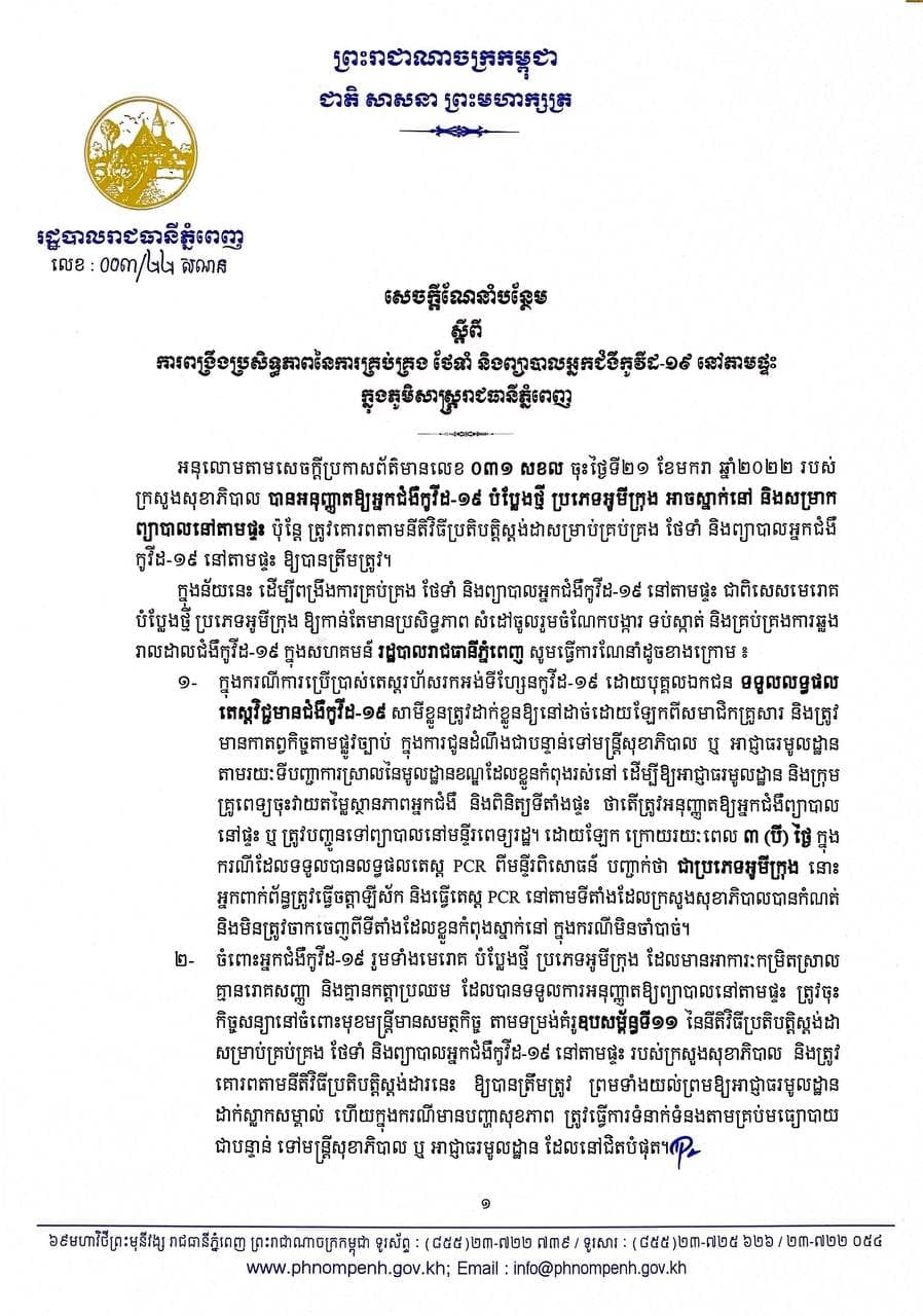 រដ្ឋបាលរាជធានីភ្នំពេញ បានចេញសេចក្ដីណែនាំបន្ថែម ស្ដីពីការពង្រឹងប្រសិទ្ធភាពនៃការគ្រប់គ្រង ថែទាំ និងព្យាបាលអ្នកជំងឺកូវីដ-១៩ នៅតាមផ្ទះ ក្នុងភូមិសាស្ត្ររាជធានីភ្នំពេញ ជាពិសេសមេរោគបំប្លែងខ្លួនថ្មី ប្រភេទអូមីក្រុង ឱ្យកាន់តែមានប្រសិទ្ធភាព សំដៅចូលរួមចំណែកបង្ការ ទប់ស្កាត់ និងគ្រប់គ្រងការឆ្លងរាលដាលជំងឺកូវីដ-១៩ ក្នុងសហគមន៍ រដ្ឋបាលរាជធានីភ្នំពេញ សូមធ្វើការណែនាំដូចខាងក្រោម៖
