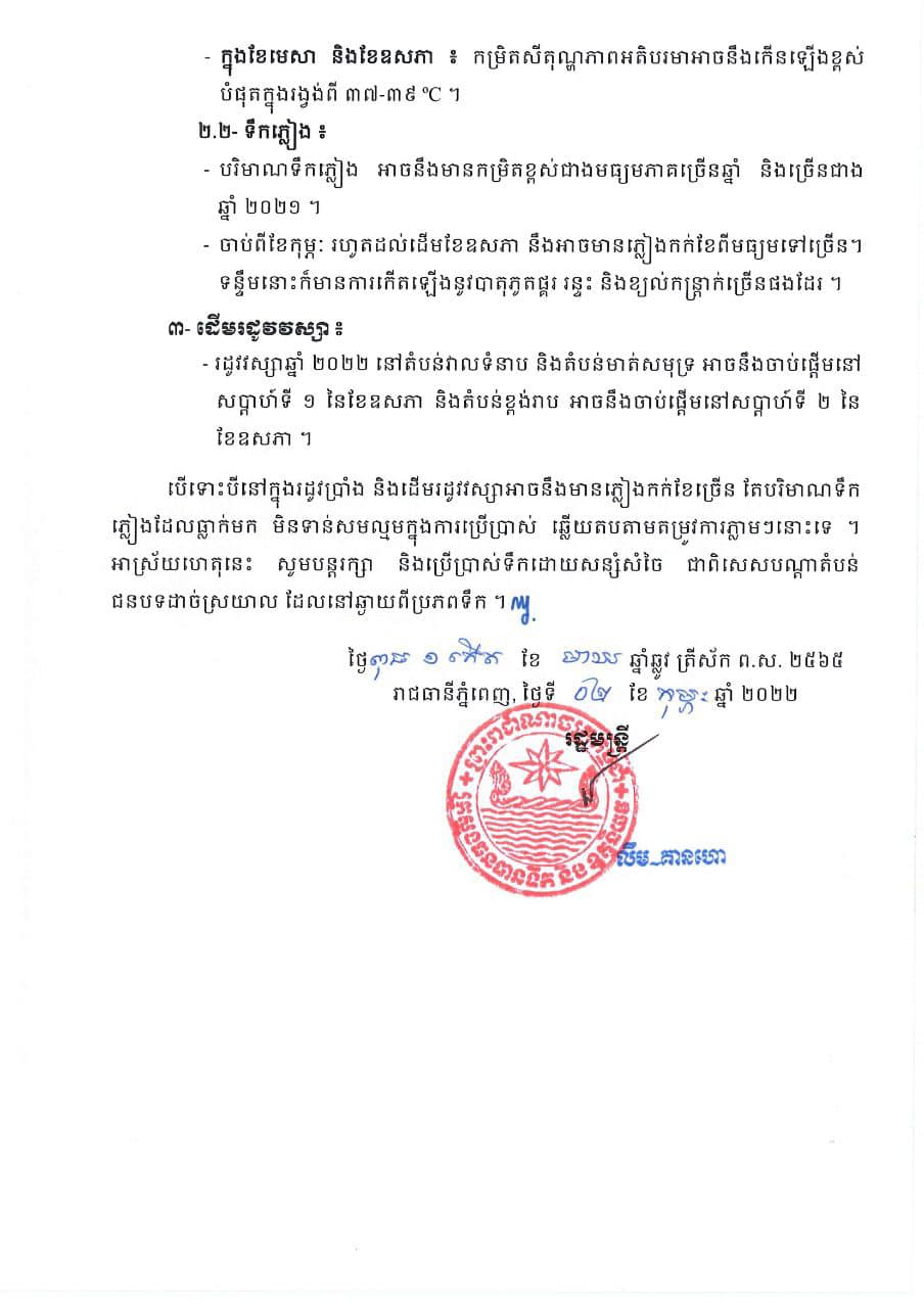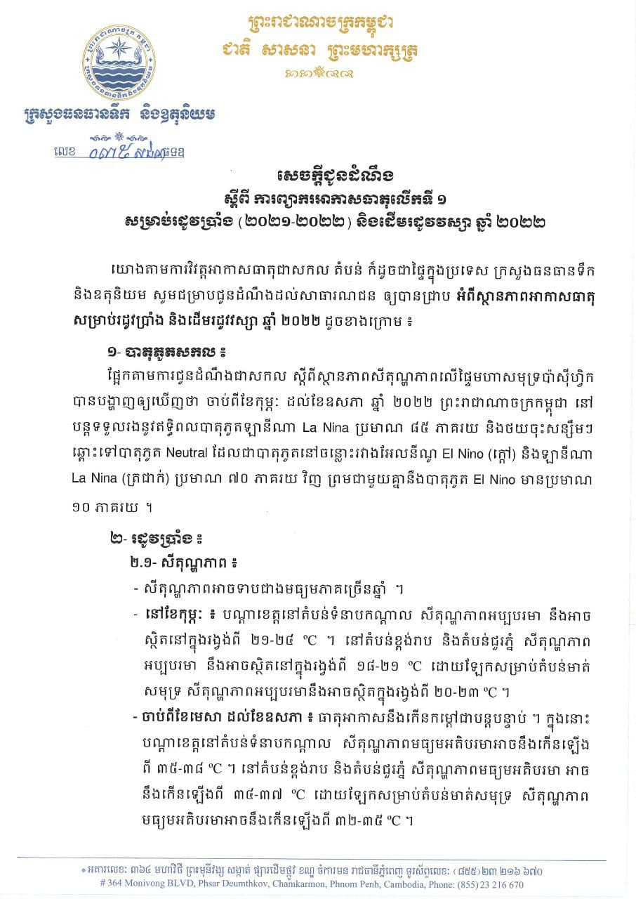 យោងតាមការព្យាករណ៍អាកាសធាតុរបស់ក្រសួងធនធានទឹក និងឧតុនិយម បានឲ្យដឹងថា យោងតាមការវិវត្តអាកាសធាតុជាសកល តំបន់ ក៏ដូចជាផ្ទៃក្នុងប្រទេស ក្រសួងសូមជម្រាបជូនដំណឹងដល់សាធារណជន ឲ្យបានជ្រាប អំពីស្ថានភាពអាកាសធាតុសម្រាប់រដូវប្រាំង និងដើមរដូវវស្សាឆ្នាំ២០២២ ដូចខាងក្រោម៖