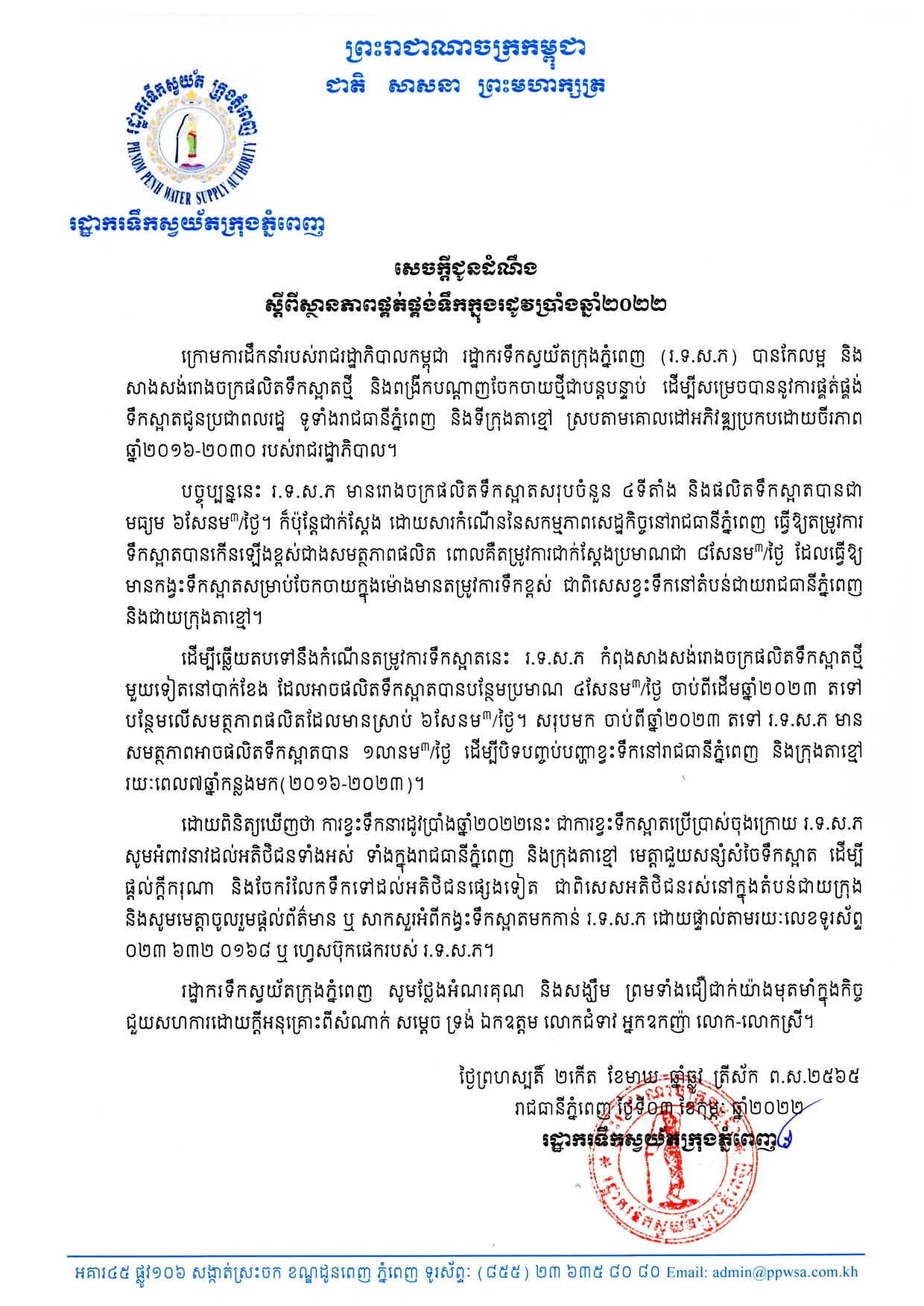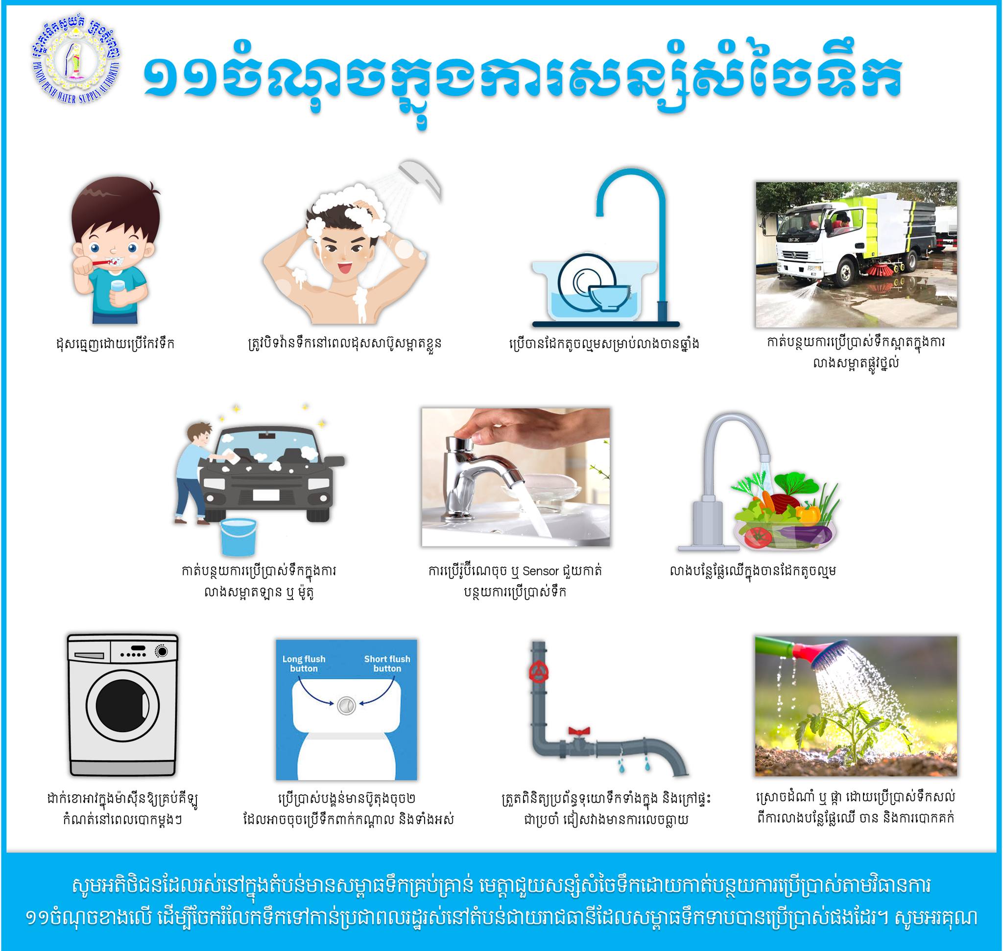 បច្ចុប្បន្នកំណើននៃសកម្មភាពសេដ្ឋកិច្ចនៅរាជធានីភ្នំពេញ និងក្រុមតាខ្មៅ មានការកើនឡើងយ៉ាងឆាប់រហ័ស ដែលធ្វើឱ្យតម្រូវការប្រើប្រាស់ទឹកស្អាតកើនខ្ពស់លើសពីសមត្ថភាពផលិត។ ដោយពិនិត្យឃើញថា ការខ្វះទឹកនារដូវប្រាំងឆ្នាំ២០២២នេះ ជាការខ្វះទឹកស្អាតប្រើប្រាស់ចុងក្រោយ រ.ទ.ស.ភ សូមអំពាវនាវដល់អតិថិជនទាំងអស់ ទាំងក្នុងរាជធានីភ្នំពេញ និងក្រុងតាខ្មៅ មេត្តាជួយសន្សំសំចៃទឹកស្អាត ដោយអនុវត្តនូវគោលការណ៍១១ចំណុច ដើម្បីផ្តល់ក្តីករុណា និងចែករំលែកទឹកទៅដល់អតិថិជនផ្សេងទៀត ជាពិសេសអតិថិជនរស់នៅក្នុងតំបន់ជាយក្រុងដែលមានសម្ពាធទឹកខ្សោយ ៕
