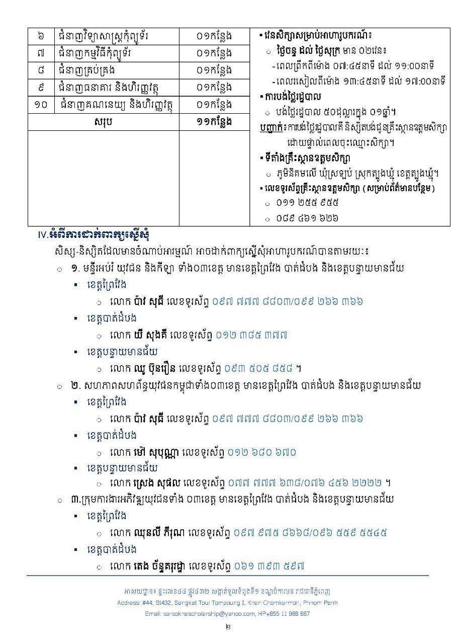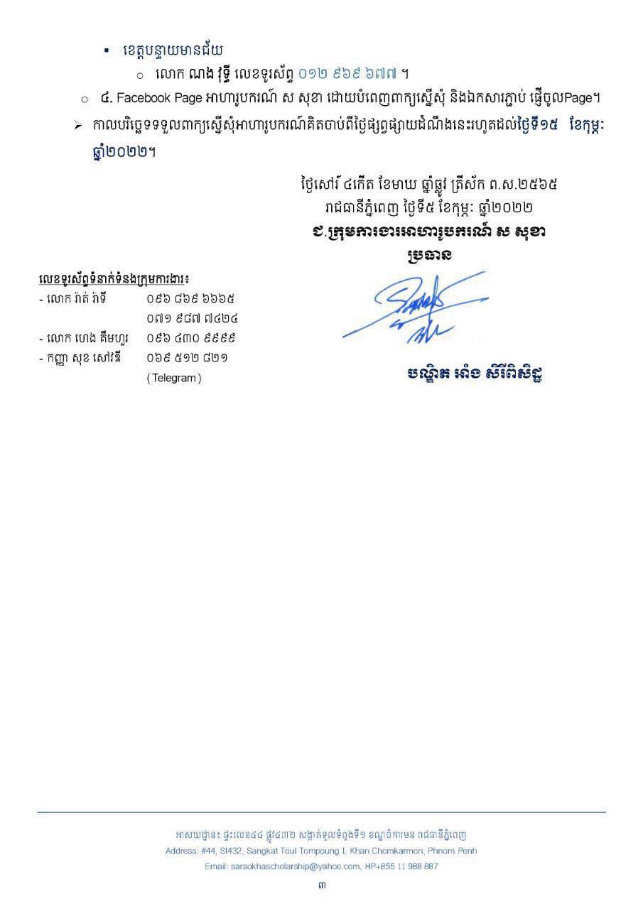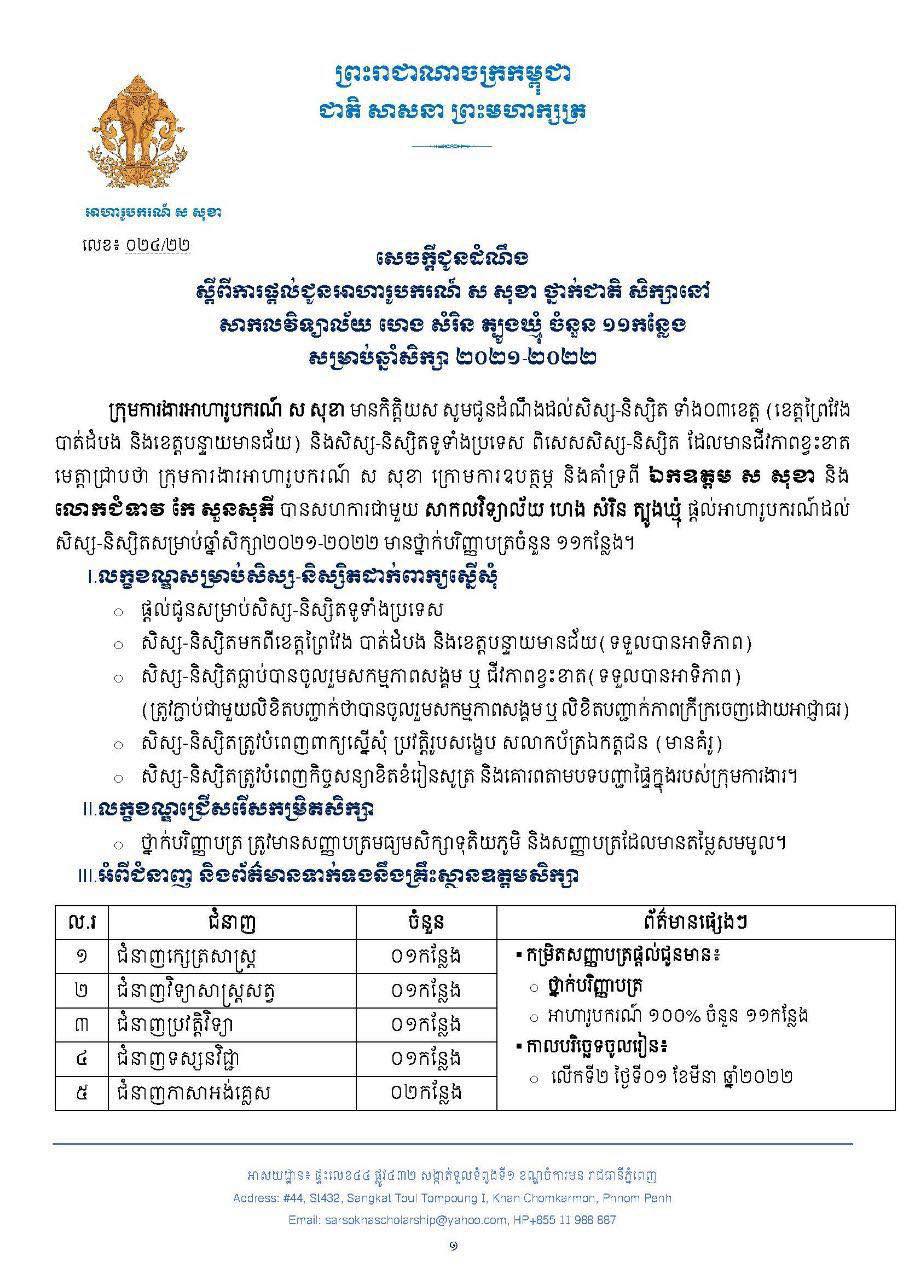 ក្រុមការងារអាហារូបករណ៍ ស សុខា មានកិត្តិយស សូមជូនដំណឹងដល់សិស្ស-និស្សិត ទាំង០៣ខេត្ត (ខេត្តព្រៃវែង បាត់ដំបង និងខេត្តបន្ទាយមានជ័យ) និងសិស្ស-និស្សិតទូទាំងប្រទេស ពិសេសសិស្ស-និស្សិត ដែលមានជីវភាពខ្វះខាតមេត្តាជ្រាបថា៖ ក្រុមការងារអាហារូបករណ៍ ក្រោមការឧបត្ថម្ភ និងគាំទ្រ ឯកឧត្តម ស សុខា និង លោកជំទាវ កែវ សួនសុភី បានសហការជាមួយ សាកលវិទ្យាល័យ ហេង សំរិន ត្បូងឃ្មុំ ផ្ដល់អាហារូបករណ៍ដល់សិស្ស-និស្សិតសម្រាប់ឆ្នាំ២០២១-២០២២ មានថ្នាក់បរិញ្ញាបត្រចំនួន ១១កន្លែង ចាប់ផ្តើមទទួលពាក្យពីថ្ងៃផ្សាយដំណឹងនេះ រហូតដល់ថ្ងៃទី១៥ ខែកុម្ភៈ ឆ្នាំ២០២២។