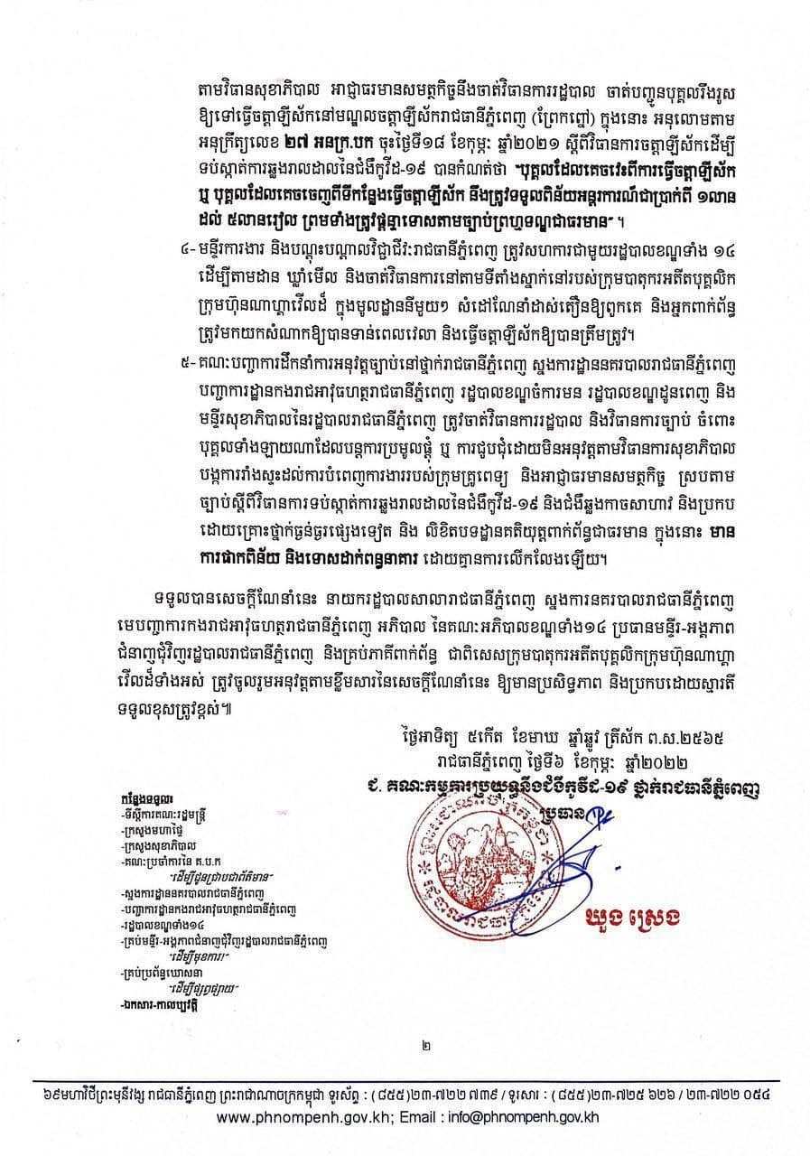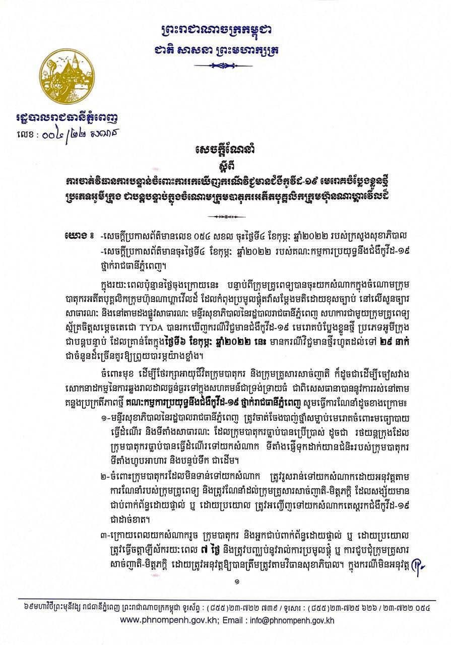 រាជធានីភ្នំពេញ៖ យោងតាមការចុះផ្សាយរបស់ រដ្ឋបាលរាជធានីភ្នំពេញ ចេញសេចក្ដីណែនាំ ស្តីពីការចាត់វិធានជាបន្ទាន់ ចំពោះការរកឃើញករណីកូវីដ-១៩ បំប្លែងខ្លួនថ្មីជាបន្តបន្ទាប់លើបាតុករអតីតបុគ្គលិកក្រុមហ៊ុនណាហ្គាវើលដ៍។