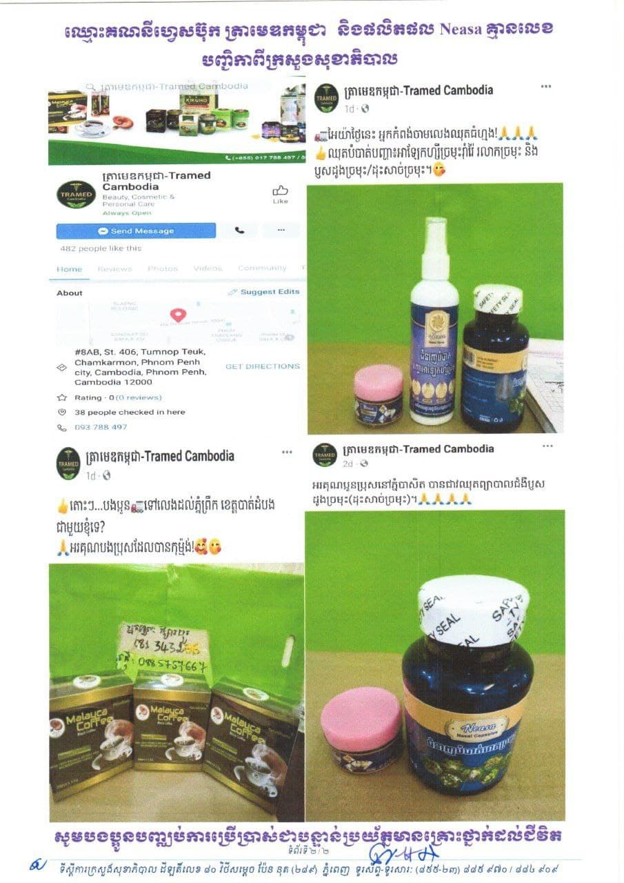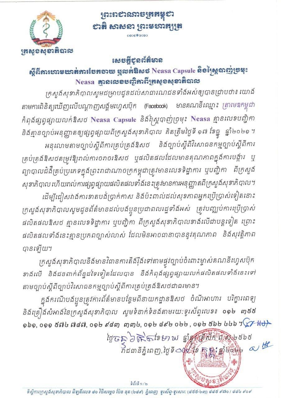 ដោយក្រសួងសុខាភិបាលសូមជម្រាបជូនដល់សាធារណជនទាំងអស់ឲ្យបានជ្រាបថា៖ យោងតាមការពិនិត្យឃើញបណ្ដាញសង្គមហ្វេស ប៊ុក មានគណនីឈ្មោះ ត្រាមេឌកម្ពុជា កំពុងផ្សព្វផ្សាយលក់ឱសថ Neasa Capsule និងស្ព្រៃបាញ់ច្រមុះ Neasa គ្មានលេខបញ្ជិកា និងគ្មានច្បាប់អនុញ្ញាតឲ្យផ្សព្វផ្សាយពីក្រសួងសុខាភិបាល គិតត្រឹមថ្ងៃទី១៧ ខែធ្នូ ឆ្នាំ២០២១។