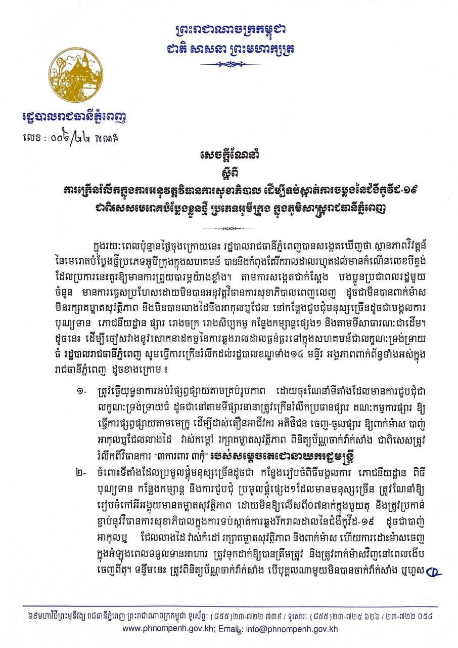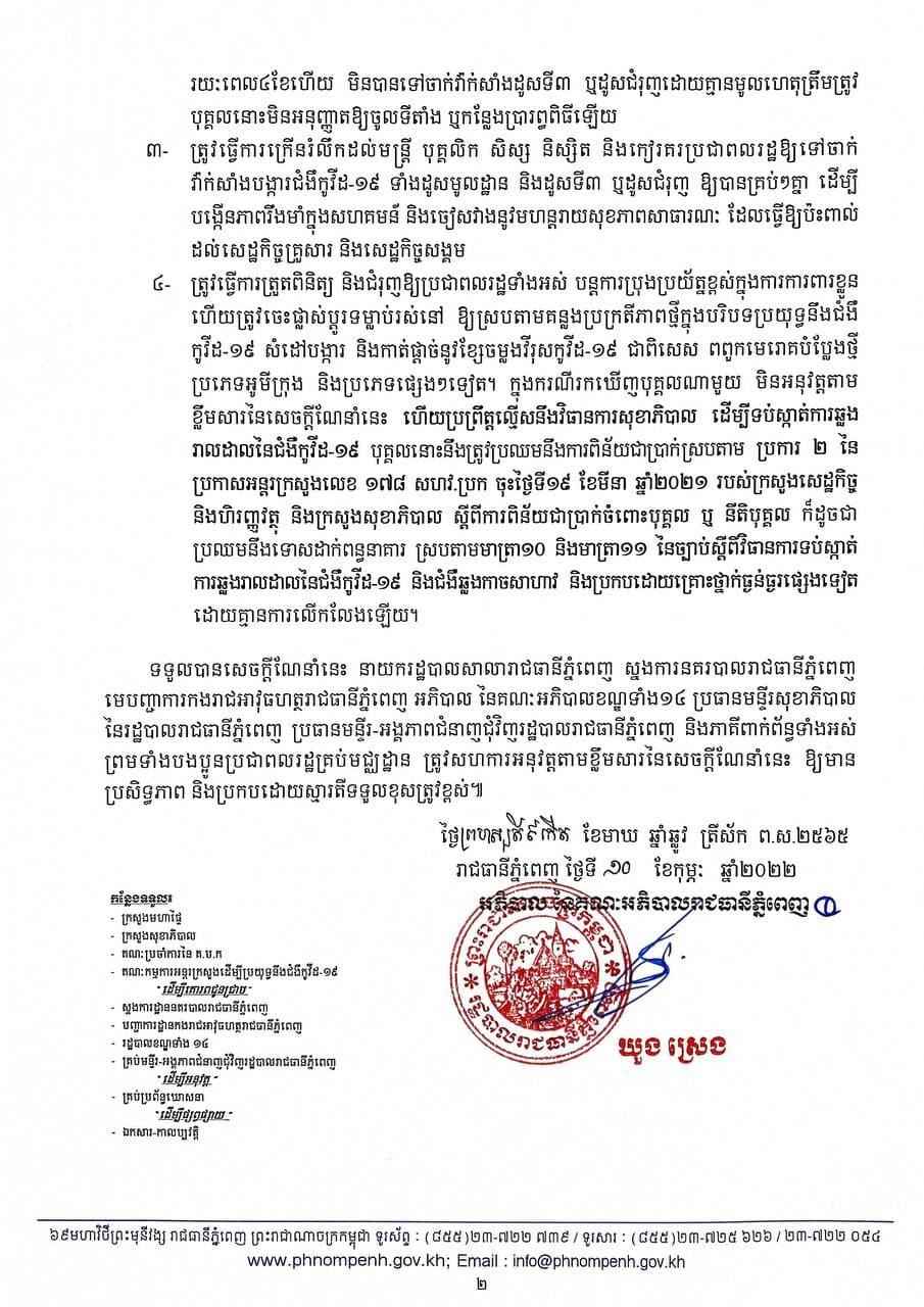រាជធានីភ្នំពេញ៖ យោងតាមការចុះផ្សាយរបស់ រដ្ឋបាលរាជធានីភ្នំពេញ នៅថ្ងៃទី១០ ខែកុម្ភៈ ឆ្នាំ២០២២ បានចេញសេចក្តីណែនាំ ស្តីពីការក្រើនរំលឹកដល់ប្រជាពលរដ្ឋ ពីការអនុវត្តវិធានការសុខាភិបាល ដើម្បីទប់ស្កាត់ការចម្លងជំងឺកូវីដ១៩ ពិសេសប្រភេទអូមីក្រុង ក្នុងភូមិសាស្ត្ររាជធានីភ្នំពេញ។