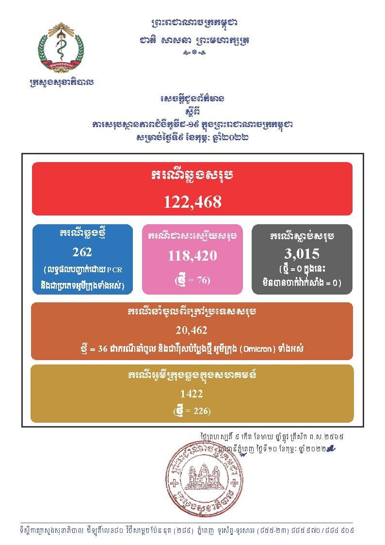 នៅថ្ងៃទី10 ខែកុម្ភៈ ឆ្នាំ2022នេះ ក្រសួងសុខាភិបាលកម្ពុជា បានចេញសេចក្តីជូនដំណឹងពី ការរកឃើញករណីវិជ្ជមានវីរុសកូវីដ១៩ថ្មី ចំនួន 262នាក់ (លទ្ធផលបញ្ជាក់ដោយ PCR នឹងជាប្រភេទអូមីក្រុងទាំងអស់) ក្នុងនោះករណីឆ្លងសហគមន៍ 226នាក់ និងករណីនាំចូល 36នាក់ ខណៈអ្នកបានជាសះស្បើយថ្មីមានចំនួន 76នាក់ និងមិនមានអ្នកបាត់បង់ជីវិតថ្មីនោះទេគិតមកទល់ពេលនេះ ករណីឆ្លងកូវីដ១៩ សរុបនៅក្នុងប្រទេសកម្ពុជា មានចំនួន 122,468នាក់, ករណីជាសះស្បើយសរុប 118,420នាក់ និងស្លាប់សរុប 3,015នាក់៕