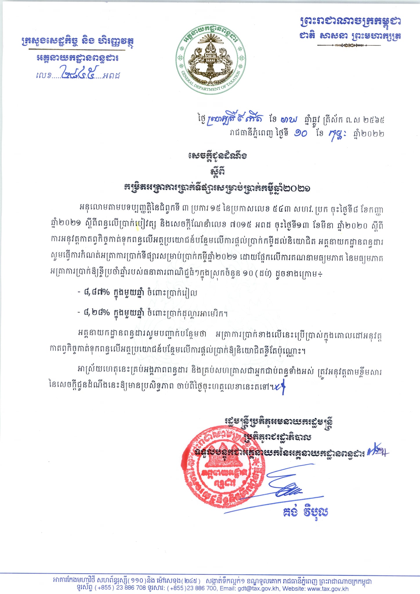 អនុលោមតាមបទប្បញ្ញត្តិនៃជំពូកទី៣ ប្រការ ១៥នៃប្រកាសលេខ ៥៤៣ សហវ.ប្រក ចុះថ្ងៃទី៨ ខែកញ្ញា ឆ្នាំ២០២១ ស្ដីពីពន្ធលើប្រាក់បៀវត្ស និងសេចក្ដីណែនាំលេខ ៧០១៥ អពដ ចុះថ្ងៃទី១៣ ខែមីនា ឆ្នាំ២០២០ ស្ដីពីការអនុវត្តកាតព្វកិច្ចកាត់ទុកពន្ធលើអត្ថប្រយោជន៍បន្ថែមលើការផ្ដល់ប្រាក់កម្ចីដល់និយោជិត អគ្គនាយកដ្ឋានពន្ធដារ សូមធ្វើការកំណត់អត្រាការប្រាក់ទីផ្សារសម្រាប់ប្រាក់កម្ចីឆ្នាំ២០២១ ដោយផ្អែកលើការគណនាមធ្យម នៃមធ្យមភាគអត្រាប្រាក់ឲ្យខ្ចីប្រចាំឆ្នាំរបស់ធនាគារពាណិជ្ជធំៗ ក្នុងស្រុកចំនួន ១០(ដប់) ដូចខាងក្រោម៖