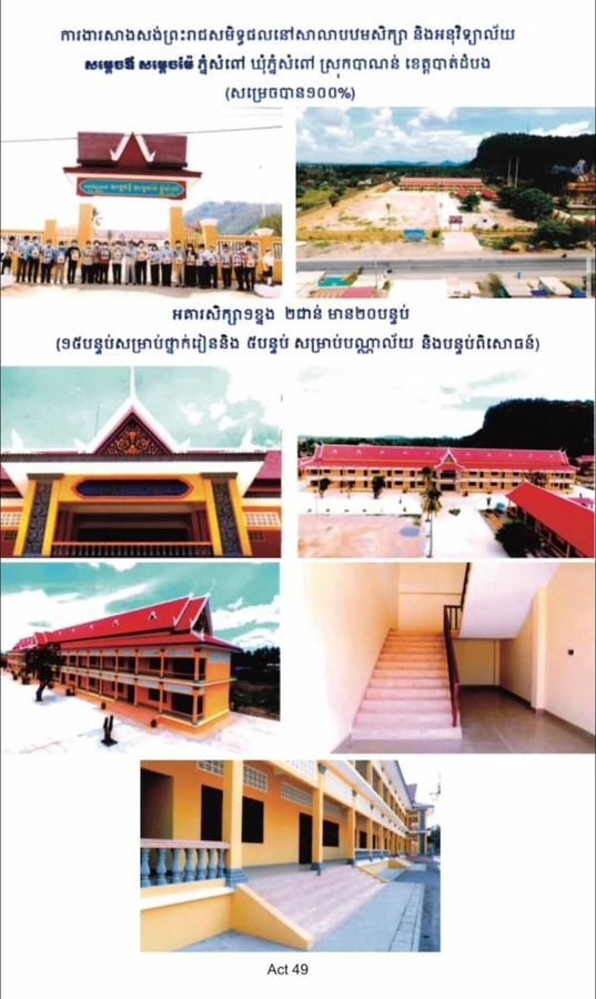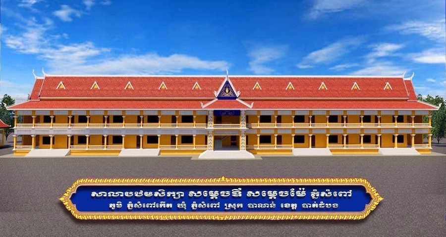 ដោយស្ថិតក្នុងព្រះរាជហឫទ័យខ្វាយខ្វល់ និងទុកដាក់ខ្ពស់ចំពោះសុខទុក្ខរបស់ប្រជានុរាស្រ្តជាកូនចៅ ចៅទួត ព្រមទាំងព្រះរាជតម្រិៈគោរពដង្ហែតាមព្រះរាជលំអានដ៏ឧត្តុង្គឧត្តម នៃព្រះករុណា ព្រះវររាជបិតាសិក្សាធិការជាតិ ព្រះបរមរតនកោដ្ឋ ជាទីគោរពសក្ការៈដ៏ខ្ពង់ខ្ពស់បំផុត ចាប់តាំងពីសម័យសង្គមរាស្រ្តនិយមដ៏រុងរឿងនៃប្រវត្តិសាស្រ្តកម្ពុជា ដែលអង្គសម្តេចព្រះវររាជបិតាសិក្សាធិការជាតិ ស្តេចបានដឹកនាំកសាងអភិវឌ្ឍជាតិខ្មែរ រីកចម្រើនជឿនលឿនលើគ្រប់វិស័យ ជាពិសេសវិស័យអប់រំសិក្សាធិការ ដែលបានបម្រើឱ្យការរស់នៅរបស់ប្រជានុរាស្រ្តមានភាពល្អប្រសើរខ្ពង់ខ្ពស់ឧត្តុង្គឧត្តមក្រៃលែង សម្តេចម៉ែ ព្រះអង្គស្តេចសព្វព្រះរាជហឫទ័យប្រោសព្រះរាជទានព្រះរាជទ្រព្យផ្ទាល់ដ៏ឧត្តុង្គឧត្តមចំនួន ១ ១៦៩ ៥៥០ ដុល្លារអាមេរិក ដើម្បីជួសជុលកែលម្អ និងសាងសង់បន្ថែមនូវព្រះរាជសមិទ្ធផលនានា ក្នុងបរិវេណសាលាបឋមសិក្សា និងអនុវិទ្យាល័យ សម្តេចឪ-សម្តេចម៉ែ ភ្នំសំពៅ ស្ថិតនៅក្នុងភូមិសំពៅកើត ឃុំភ្នំសំពៅ ស្រុកបាណន់ ខេត្តបាត់ដំបង សម្រាប់តម្កល់ជាឧត្តមប្រយោជន៍ជាតិ និងប្រជាជនកម្ពុជា។