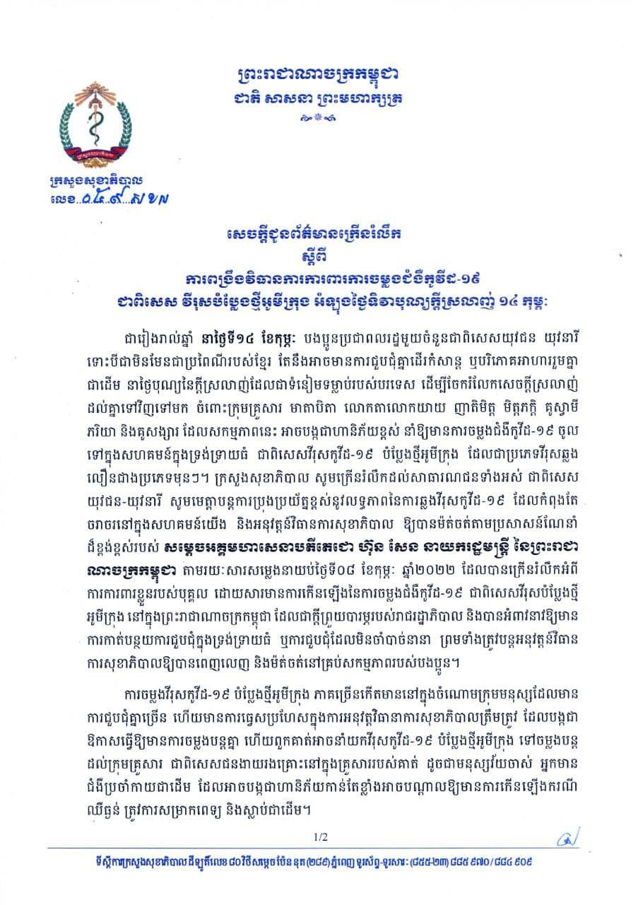 រាជធានីភ្នំពេញ៖ យោងតាមការចុះផ្សាយរបស់ ក្រសួងសុខាភិបាល នៅថ្ងៃទី១១ ខែកុម្ភៈ ឆ្នាំ២០២២ បានចេញសេចក្ដីជូនព័ត៌មានក្រើនរំលឹក ស្ដីពីការពង្រឹងវិធានការការពារចម្លងជំងឺកូវីដ-១៩ ជាពិសេស វីរុសបំប្លែងថ្មីអូមីក្រុង អំឡុងថ្ងៃទិវាបុណ្យក្ដីស្រលាញ់ ១៤កុម្ភៈ ។