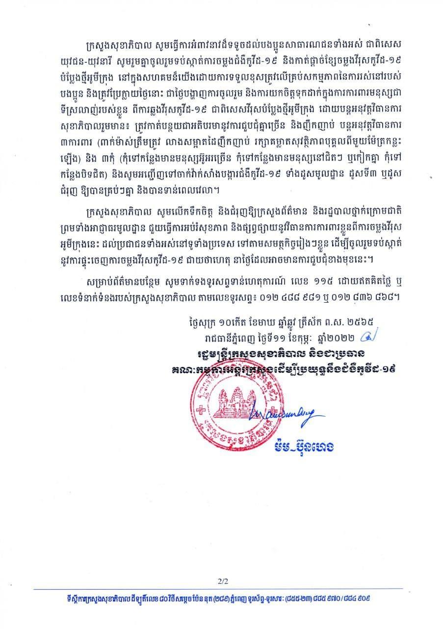 ក្រសួងសុខាភិបាល សូមក្រើនរំលឹកដល់សាធារណជនទាំងអស់ ជាពិសេសយុវជន-យុវនារី សូមមេត្តាបន្តការប្រុងប្រយ័ត្នខ្ពស់នូវលទ្ធភាពនៃការឆ្លងវីរុសកូវីដ-១៩ ដែលកំពុងតែចរាចរនៅក្នុងសហគមន៍យើង និងអនុវត្តន៍វិធានការសុខាភិបាល ឱ្យបានម៉ត់ចត់តាមប្រសាសន៍ណែនាំរបស់ សម្តេចតេជោ ហ៊ុន សែន នាយករដ្ឋមន្ត្រីនៃកម្ពុជា តាមរយៈសារសម្លេងនាយប់ថ្ងៃទី០៨ ខែកុម្ភៈ ឆ្នាំ២០២២ ដែលបានក្រើនរំលឹកអំពីការការពារខ្លួនរបស់បុគ្គល ដោយសារមានការកើនឡើង នៃការចម្លងជំងឺកូវីដ-១៩ ជាពិសេសវីរុសបំប្លែងថ្មីអូមក្រុង នៅកម្ពុជា ដែលជាក្តីព្រួយបារម្ភរបស់រាជរដ្ឋាភិបាល និងបានអំពាវនាវឱ្យមានការកាត់បន្ថយការជួបជុំក្នុងទ្រង់ទ្រាយធំ ឬការជួបជុំដែលមិនចាំបាច់នានា ព្រមទាំងត្រូវបន្តអនុវត្តន៍វិធាន ការសុខាភិបាលឱ្យបានពេញលេញ និងម៉ត់ចត់នៅគ្រប់សកម្មភាពរបស់បងប្អូន។