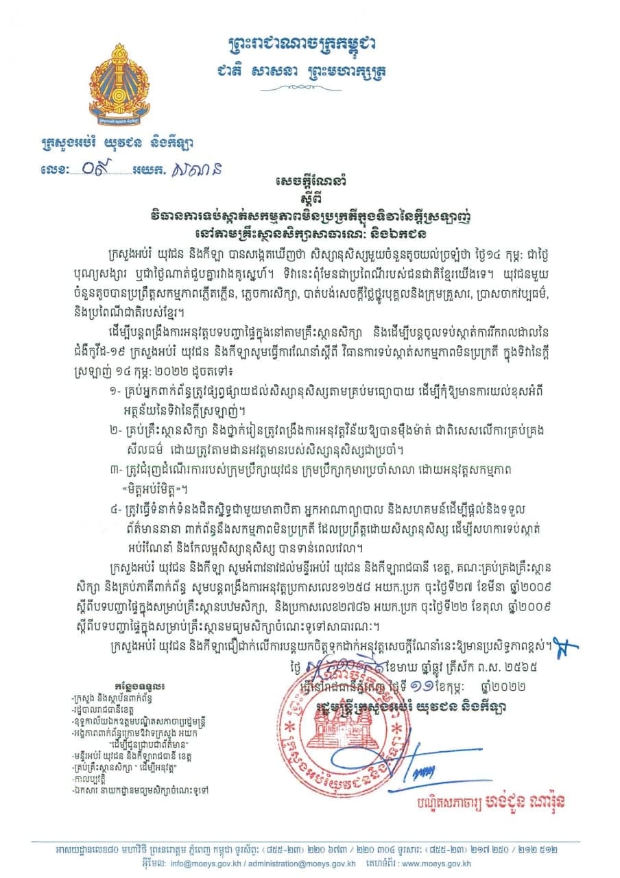រាជធានីភ្នមពេញ៖ យោងតាមការចុះផ្សាយរបស់ ក្រសួងអប់រំ យុវជន និងកីឡា នៅថ្ងៃទី១១ ខែកុម្ភៈ ឆ្នាំ២០២២ បានចេញសេចក្តីណែនាំ ស្ដីពីវិធានការទប់ស្កាត់សកម្មភាពមិនប្រក្រតីក្នុងទិវានៃក្តីស្រឡាញ់នៅតាមគ្រឹះស្ថានសិក្សាសាធារណៈ និងឯកជន។