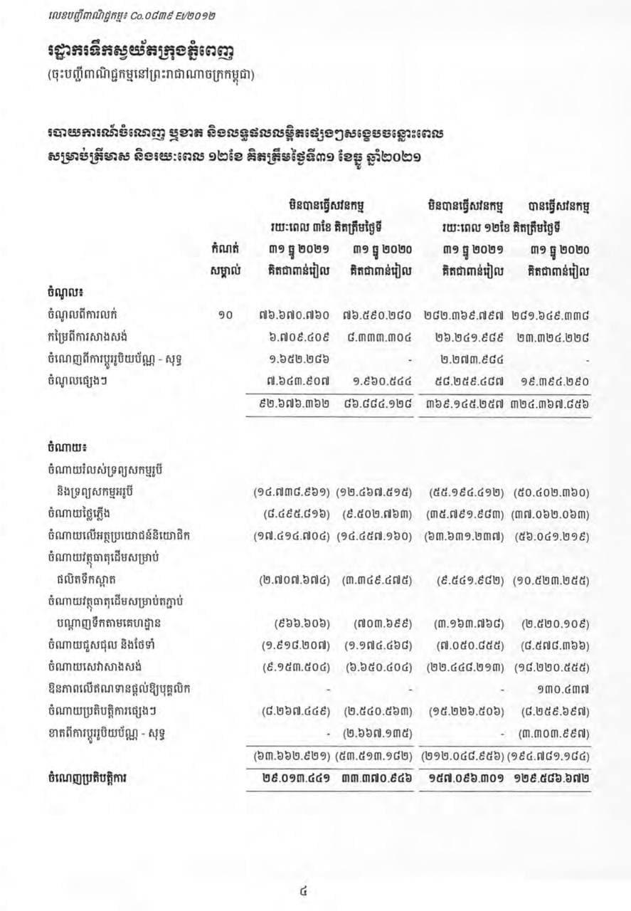 រាជធានីភ្នំពេញ៖ យោងតាមរបាយការណ៍រយៈពេល ១២ខែ គិតត្រឹមថ្ងៃទី៣១ ខែធ្នូ ឆ្នាំ២០២១ រដ្ឋាករទឹកស្វយ័តក្រុងភ្នំពេញ ដែលជាស្ថាប័នចុះបញ្ជីក្នុងទីផ្សារមូលបត្រកម្ពុជា រកចំណូលបានប្រមាណ៩០លានដុល្លារ កើនឡើងជាង១០លានដុល្លារ បើប្រៀបធៀបនឹងឆ្នាំ២០២០ មានប្រមាណជាង៧៩លានដុល្លារអាមេរិក។