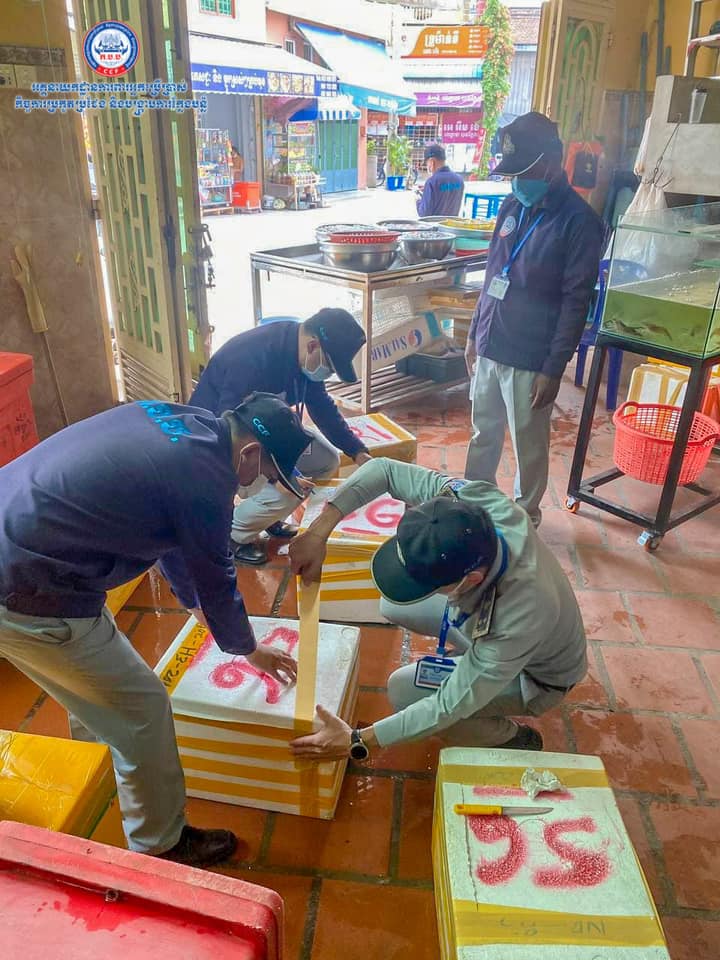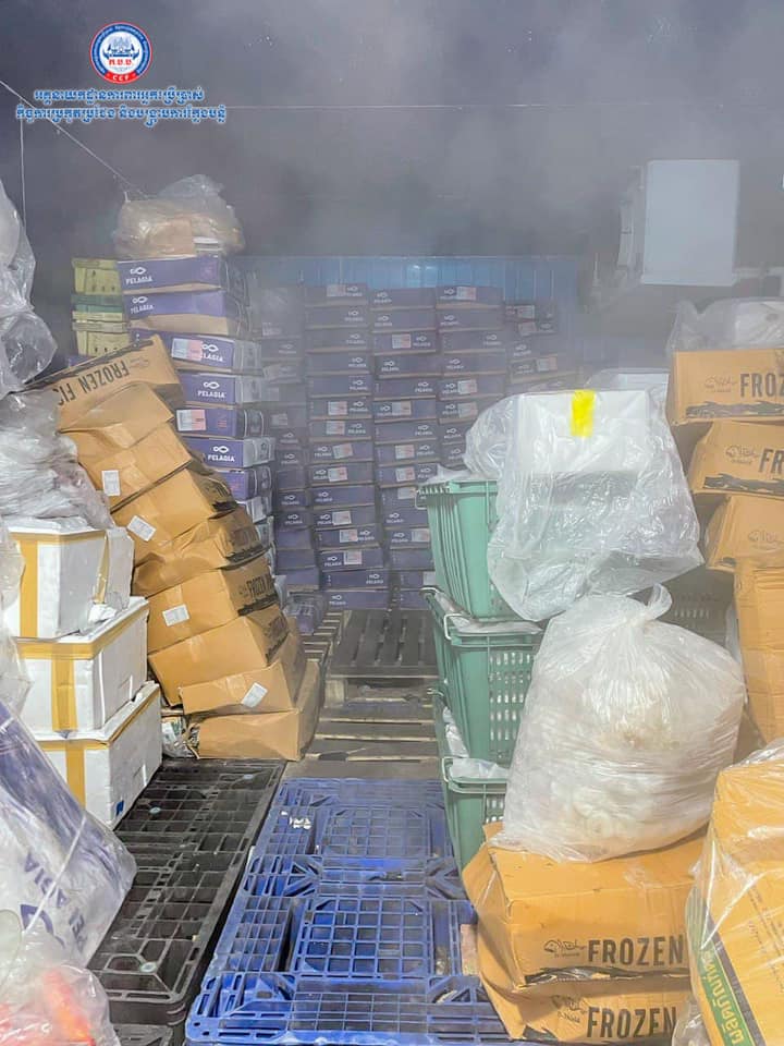 មន្ត្រីជំនាញ រកឃើញទំនិញប្រភេទសាច់បង្កកគ្មានប្រភពឯកសារច្បាស់លាស់ប្រមាណ ៣.៦តោន និងបង្គាមានចាក់សារធាតុចាហួយជាង៤០គីឡូក្រាម ត្រូវបានឃាត់ទុកនៅទីតាំងមួយកន្លែងក្នុងរាជធានីភ្នំពេញ