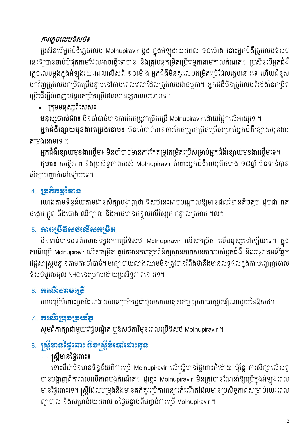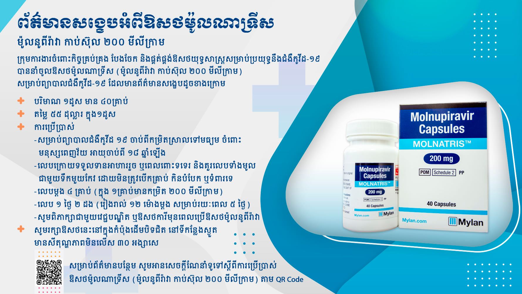 រាជធានីភ្នំពេញ៖ មួយរយៈចុងក្រោយនេះ យើងសង្កេតឃើញករណីឆ្លងជំងឺកូវីដ-១៩ បំប្លែងថ្មី ប្រភេទ អូមីក្រុង មានការកើនឡើងជាលំដាប់នៅក្នុងសហគមន៍។ ដើម្បីបន្តចូលរួមទប់ស្កាត់ការឆ្លងរាលដាលនៃជំងឺកូវីដ-១៩ បានទាន់ពេលវេលា និងបង្កើតបានភាពស៊ាំសហគមន៍រឹងមាំទប់ទល់នឹងជំងឺកូវីដ-១៩ ក្រសួងបាននាំចូលឱសថម៉ូលណាទ្រីស (ម៉ូលនូពីរ៉ាវា កាប់ស៊ុល ២០០ មីលីក្រាម) MOLNATRIS (Molnupiravir Capsules 200mg) សម្រាប់ព្យាបាលជំងឺកូវីដ-១៩ ចាប់ពីកម្រិតស្រាលទៅមធ្យម ចំពោះមនុស្សពេញវ័យ។