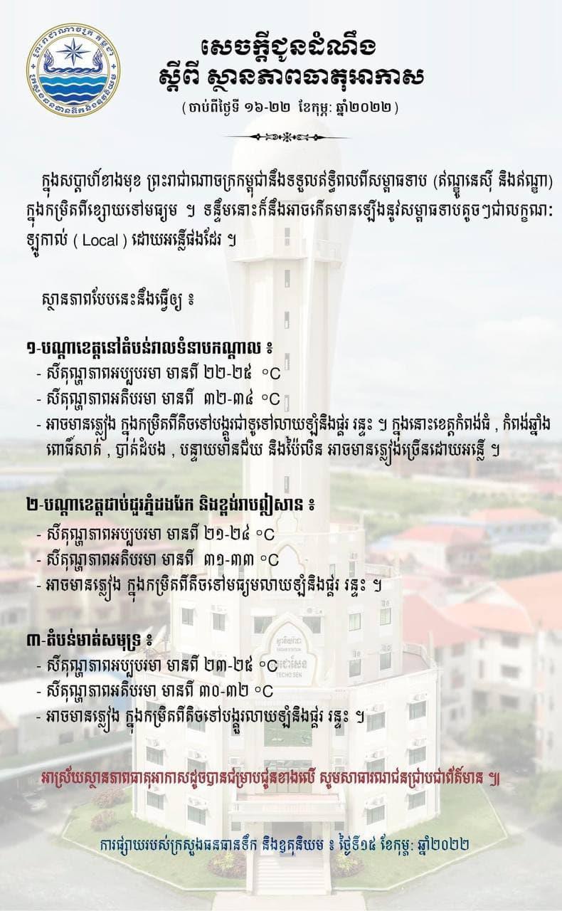រាជធានីភ្នំពេញ៖ យោងតាមការចុះផ្សាយរបស់ ក្រសួងធនធានទឹក និងឧតុនិយម នៅថ្ងៃទី១៥ ខែកុម្ភៈ ឆ្នាំ២០២២ បានចេញសេចក្ដីជូនដំណឹងស្ដីពី ស្ថានភាពធាតុអាកាស ចាប់ពីថ្ងៃទី១៧ ដល់ថ្ងៃទី២២ ខែកុម្ភៈ ឆ្នាំ២០២២ បានឲ្យជ្រាបថា៖