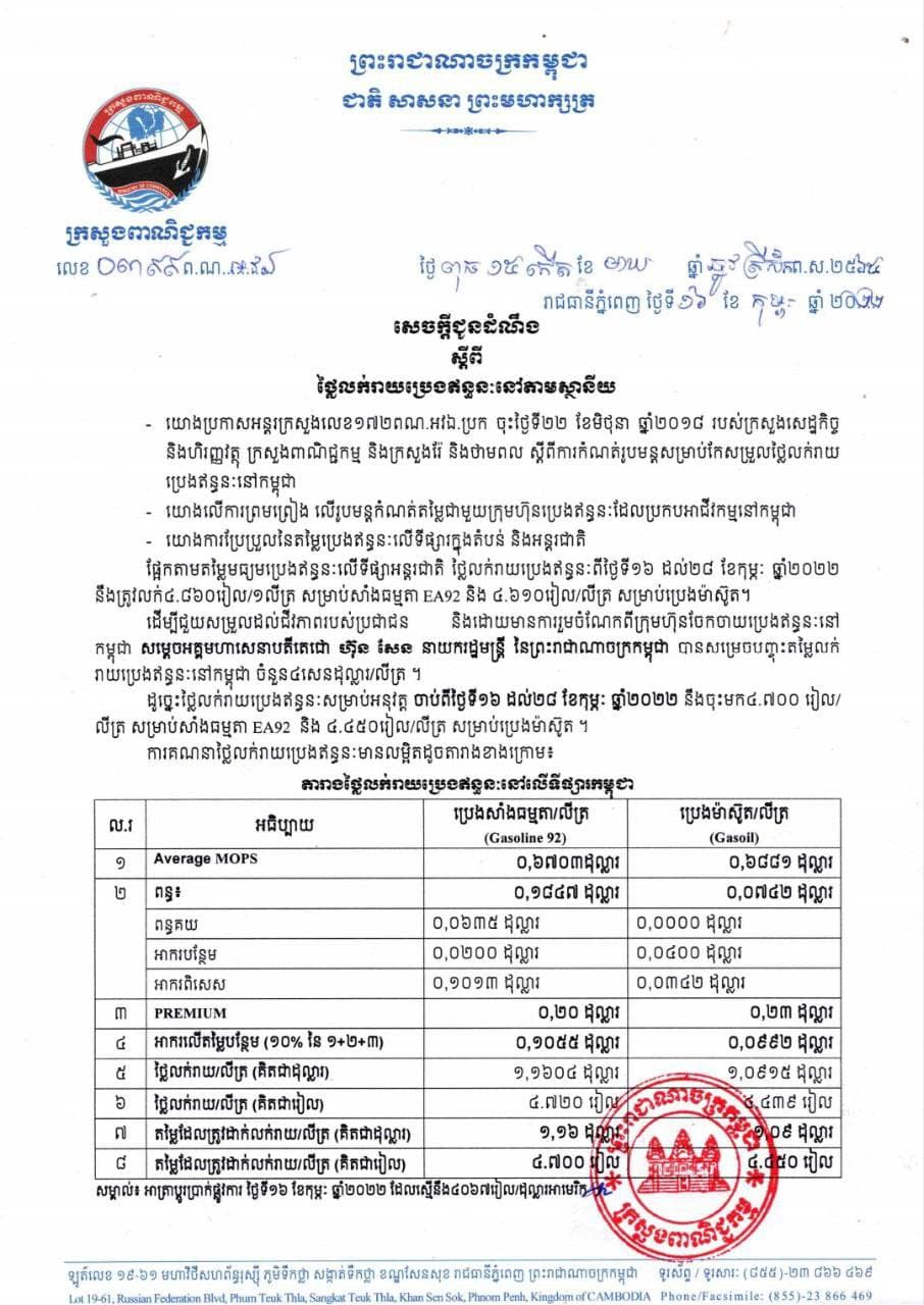 រាជធានីភ្នំពេញ៖ យោងតាមលិខិតរបស់ក្រសួងពាណិជ្ជកម្ម ចុះផ្សាយថ្ងៃទី១៦ ខែកុម្ភៈ ឆ្នាំ២០២២ ស្តីអំពីតម្លៃលក់រាយប្រេងឥន្ធនៈនៅតាមស្ថានីយទាំងអស់ក្នុងព្រះរាជាណាចក្រកម្ពុជាសម្រាប់អនុវត្តទៅតាមតម្លៃមធ្យមប្រេងឥន្ធនៈលើទីផ្សារអន្តរជាតិ ចាប់ពីថ្ងៃទី១៦ ដល់ថ្ងៃទី២៨ ខែកុម្ភៈ ឆ្នាំ២០២២ បានឲ្យដឹងថា តម្លៃប្រេងសាំងធម្មតាមានតម្លៃ ៤,៧០០រៀលក្នុងមួយលីត្រ ចំណែកឯប្រេងសាំងម៉ាស៊ូតមានតម្លៃ ៤,៤៥០រៀលក្នុងមួយលីត្រប៉ុណ្ណោះ។