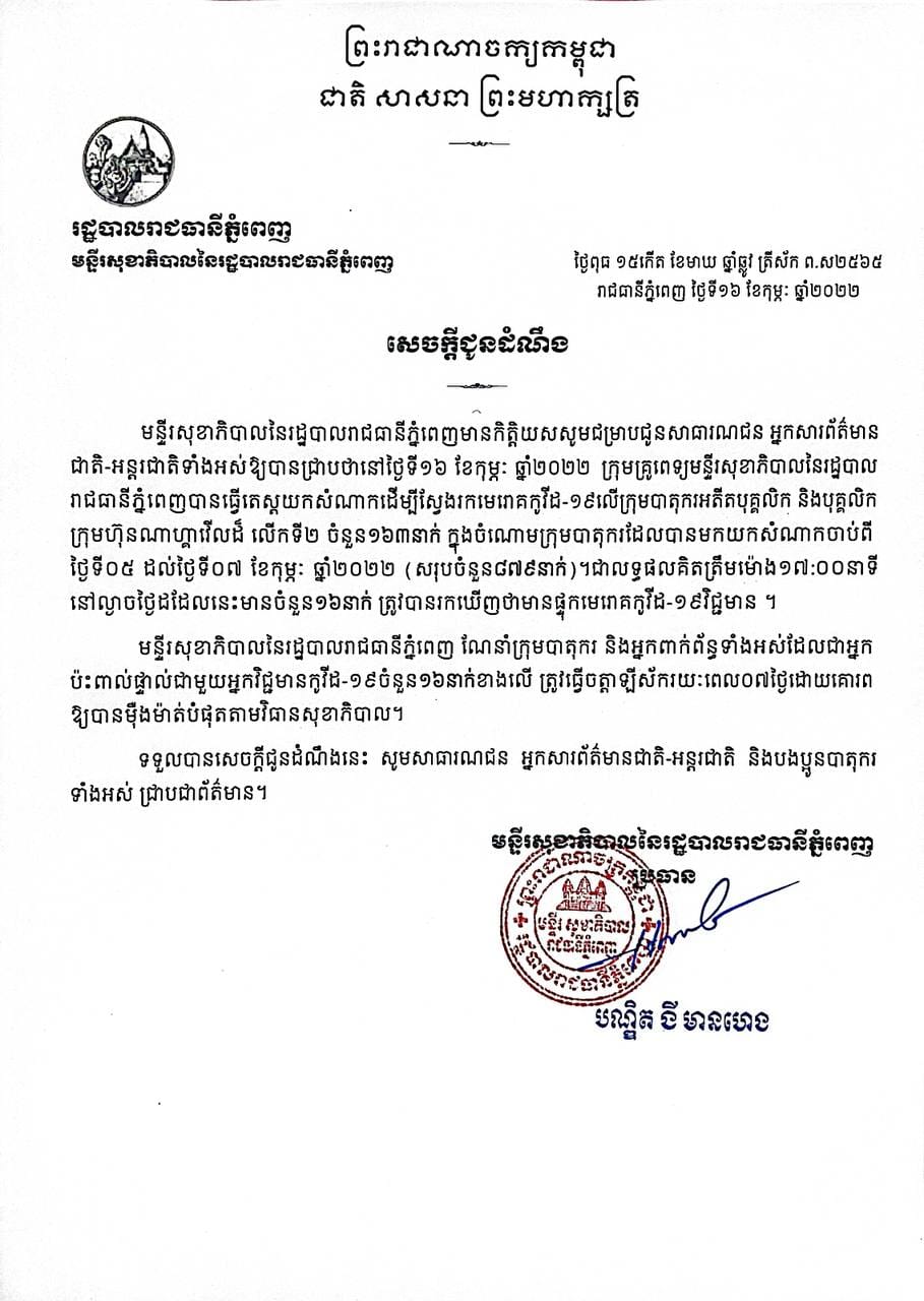 មន្ទីរសុខាភិបាលនៃរដ្ឋបាលរាជធានីភ្នំពេញ ណែនាំក្រុមបាតុករ និងអ្នកពាក់ព័ន្ធទាំងអស់ដែលជាអ្នកប៉ះពាល់ផ្ទាល់ជាមួយអ្នកវិជ្ជមានកូវីដ-១៩ ចំនួន១៦នាក់ខាងលើ ត្រូវធ្វើចត្តាឡីស័ករយៈពេល០៧ថ្ងៃ ដោយគោរពឲ្យបានម៉ឺងម៉ាត់បំផុតតាមវិធានសុខាភិបាល៕