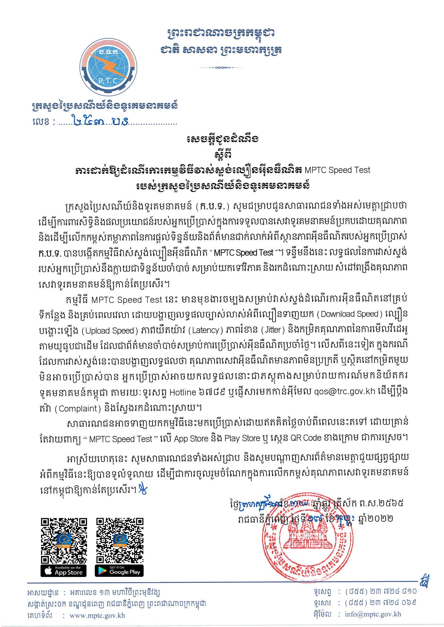 រាជធានីភ្នំពេញ៖ យោងតាមការចុះផ្សាយរបស់ ក្រសួងប្រៃសណីយ៍ និងទូរគមនាគមន៍ បានឲ្យដឹងថា ដើម្បីការពារសិទ្ធិនិងផលប្រយោជន៍របស់អ្នកប្រើប្រាស់ក្នុងការទទួលបានសេវាទូរគមនាគមន៍ប្រកបដោយគុណភាព និងដើម្បីលើកកម្ពស់តម្លាភាពនៃការផ្តល់ទិន្នន័យនិងព័ត៌មានជាក់លាក់អំពីស្ថានភាពអ៊ីនធឺណិតរបស់អ្នកប្រើប្រាស់ ក.ប.ទ. បានបង្កើតកម្មវិធីវាស់ស្ទង់ល្បឿនអ៊ីនធឺណិត “ MPTC Speed Test ”។