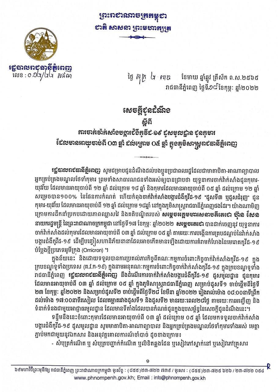រាជធានីភ្នំពេញ៖ យោងតាមការចុះផ្សាយរបស់ រដ្ឋបាលរាជធានីភ្នំពេញ នៅថ្ងៃទី១៨ ខែកុម្ភៈ ឆ្នាំ២០២២ បានចេញសេចក្ដីជូនដំណឹង ស្ដីពី ការចាក់វ៉ាក់សាំងបង្ការជំងឺកូវីដ-១៩ ដូសមូលដ្ឋាន ជូនកុមារ ដែលមានអាយុចាប់ពី ០៣ឆ្នាំ ដល់ក្រោម ០៥ឆ្នាំ ក្នុងភូមិសាស្ត្ររាជធានីភ្នំពេញ។