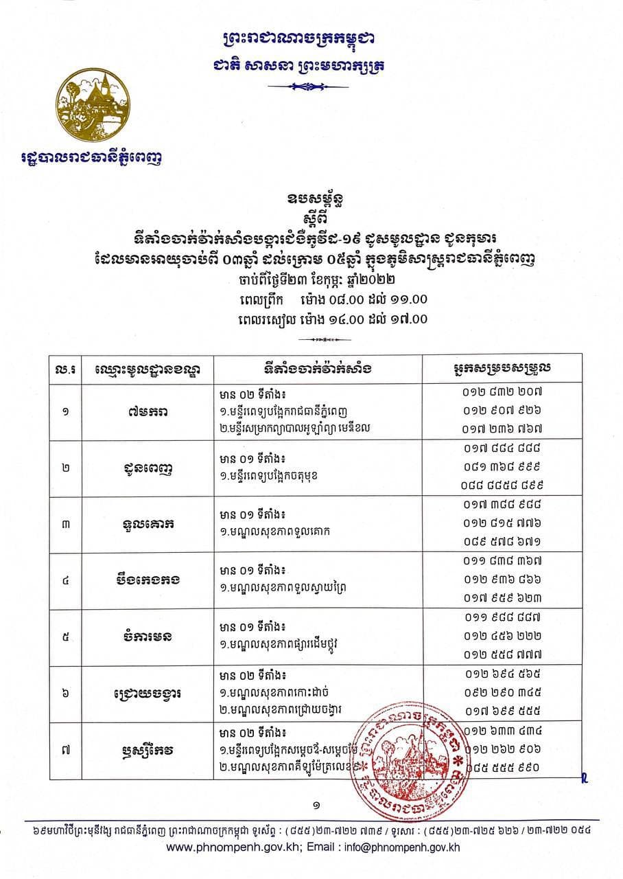 រដ្ឋបាលរាជធានីភ្នំពេញ ជូនដំណឹងពីពេលវេលា និងទីតាំង ការចាក់វ៉ាក់សាំងបង្ការជំងឺកូវីដ-១៩ ដូសមូលដ្ឋានជូនកុមារអាយុចាប់ពី ៣ឆ្នាំ ដល់ក្រោម ៥ឆ្នាំ