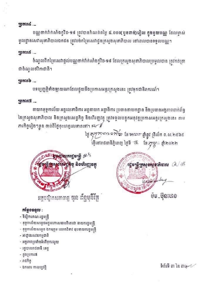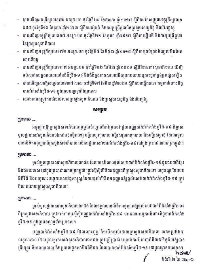 អនុញ្ញាតឲ្យក្រសួងសុខាភិបាលប្រមូលចំណូលពីកម្រៃសេវាផ្ដល់បណ្ណចាក់វ៉ាក់សាំងកូវីដ-១៩ ពីម្ចាស់មូលដ្ឋានសេវាសុខាភិបាលឯកជន (មន្ទីរពេទ្យ មន្ទីរពហុព្យាបាល មន្ទីរសម្រាកព្យាបាល និងមន្ទីរសម្ពព) ដែលទទួលបានលិខិតអនុញ្ញាតពីក្រសួងសុខាភិបាល លើការផ្ដល់សេវាចាក់វ៉ាក់សាំងកូវីដ-១៩ នៅក្នុងព្រះរាជាណាចក្រកម្ពុជា។