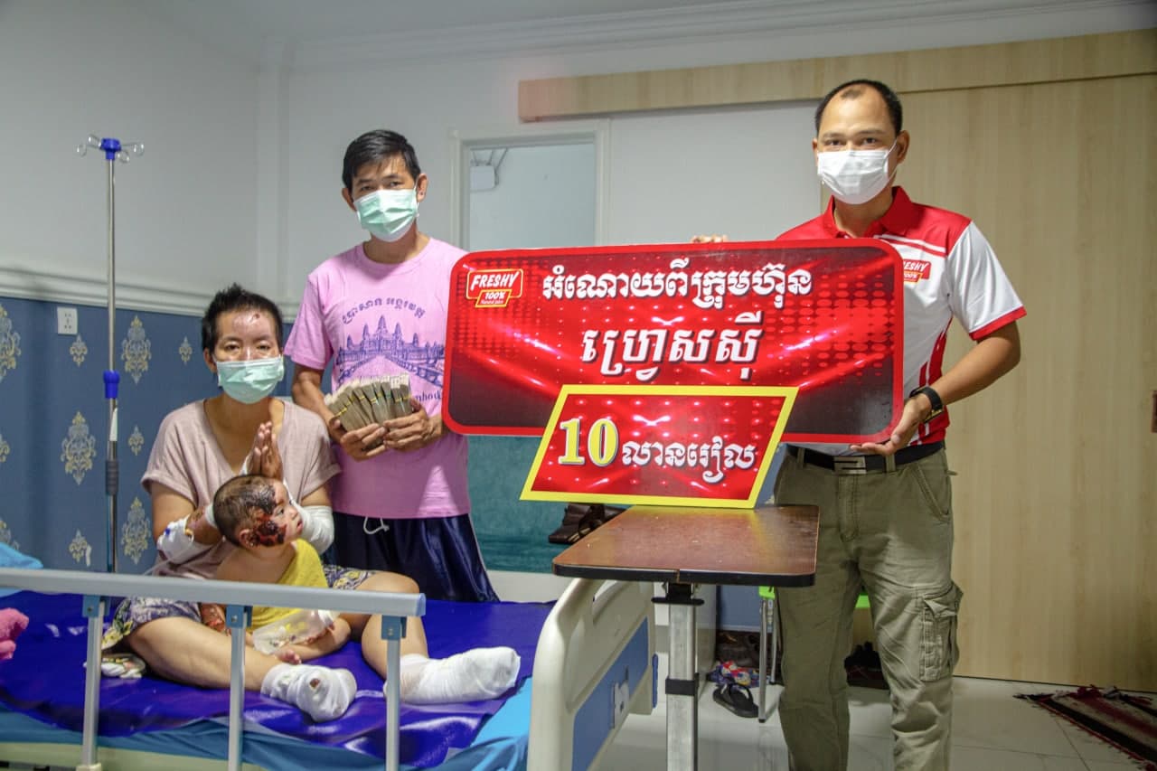 នៅវេលាព្រឹកថ្ងៃទី ១៩ខែកុម្ភៈនេះក្រោយពីបានឃើញព័ត៌មានអំពីកាលសុំជំនួយដើម្បីព្យាបាលពីសំណាក់ម្ដាយកូនដែលរងគ្រោះធ្ងន់ធ្ងរដោយភ្លើងឆេះកាលពីថ្ងៃទី០៥ ខែកុម្ភៈឆ្នាំ២០២២រួចមក ក្រុមការងារក្រុមហ៊ុនទឹកផ្លែឈើហ្វ្រេសស៊ីបាននាំយកថវិកា ១០លានរៀល និងទឹកដោះគោហ្វ្រេសស៊ីសម្រាប់ញ៉ាំពេញ១ឆ្នាំដើម្បីបំប៉នសុខភាពក្មេងស្រីអាយុ១១ខែឲ្យមានសុខភាពរឹងមាំឡើងវិញ។