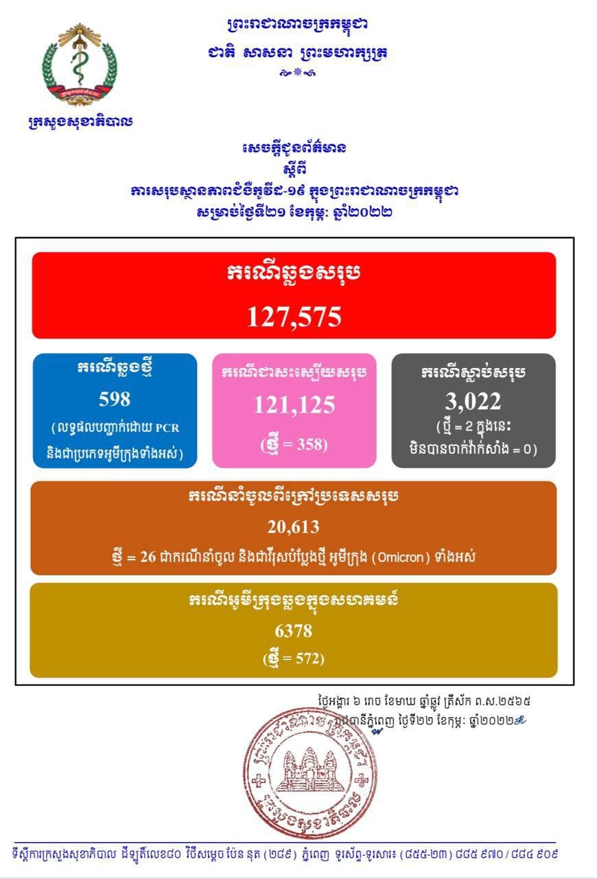 នៅថ្ងៃទី22 ខែកុម្ភៈ ឆ្នាំ2022នេះ ក្រសួងសុខាភិបាលកម្ពុជា បានចេញសេចក្តីជូនដំណឹងពី ការរកឃើញករណីវិជ្ជមានវីរុសកូវីដ១៩ថ្មី ចំនួន 598នាក់ (លទ្ធផលបញ្ជាក់ដោយ PCR នឹងជាប្រភេទអូមីក្រុងទាំងអស់) ក្នុងនោះករណីឆ្លងសហគមន៍ 572នាក់ និងករណីនាំចូល 26នាក់ ខណៈអ្នកបានជាសះស្បើយថ្មីមានចំនួន 358នាក់ និងមានអ្នកបាត់បង់ជីវិតថ្មីចំនួន02នាក់ (ក្នុងនេះមិនបានចាក់វ៉ាក់សាំងចំនួន ០នាក់)​ ហើយគិតមកទល់ពេលនេះ ករណីឆ្លងកូវីដ១៩ សរុបនៅក្នុងប្រទេសកម្ពុជា មានចំនួន 127,575 នាក់, ករណីជាសះស្បើយសរុប 121,125 នាក់ និងស្លាប់សរុប 3,022នាក់៕​​