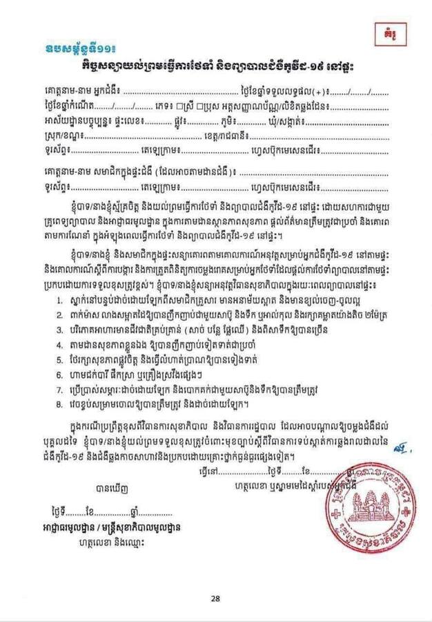 សន្យាអនុវត្តវិធានសុខាភិបាលក្នុងរយៈពេលព្យាបាលនៅផ្ទះ ក្នុងនោះរួមមាន៖