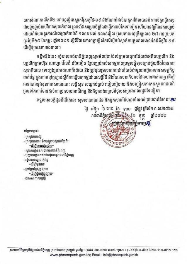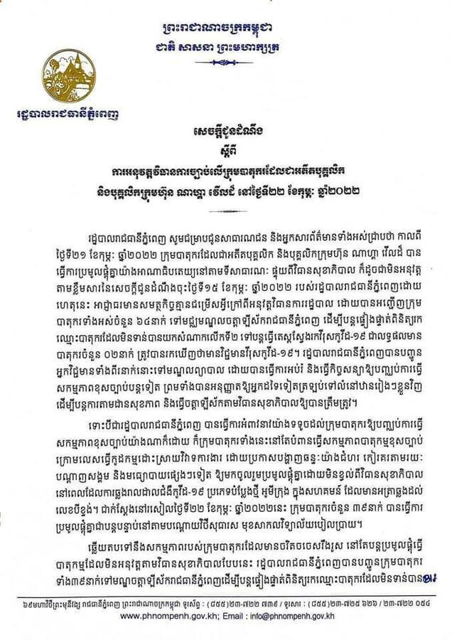រាជធានីភ្នំពេញ៖ យោងតាមការចុះផ្សាយរបស់ រដ្ឋបាលរាជធានីភ្នំពេញ នៅថ្ងៃទី២៣ ខែកុម្ភៈ ឆ្នាំ២០២២ បានចេញសេចក្ដីជូនដំណឹង ស្ដីពីការអនុវត្តវិធានការច្បាប់លើក្រុមបាតុករដែលជាអតីតបុគ្គលិក និងបុគ្គលិកក្រុមហ៊ុន ណាហ្គា វើលដ៏ នៅថ្ងៃទី២២ ខែកុម្ភៈ ឆ្នាំ២០២២។