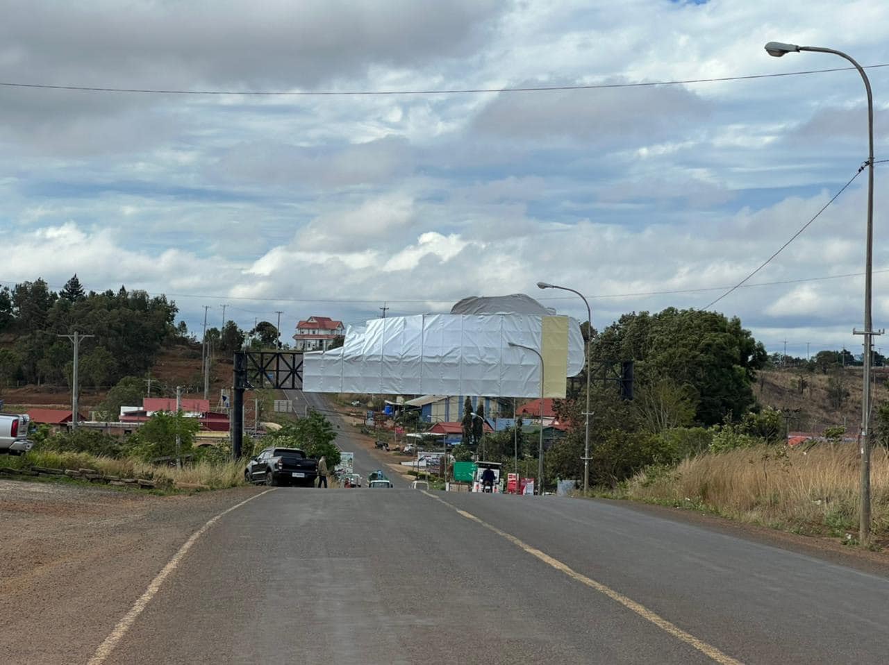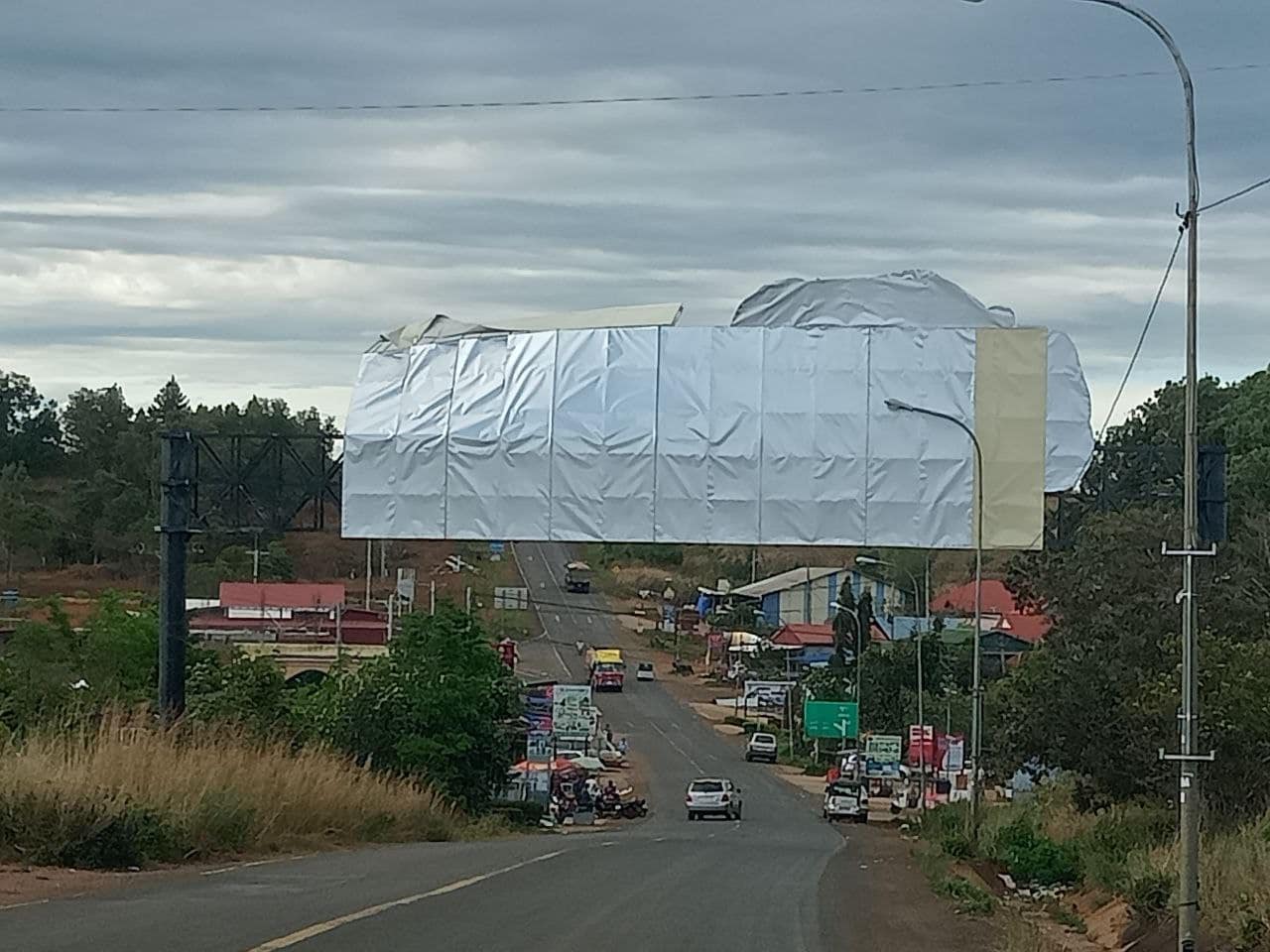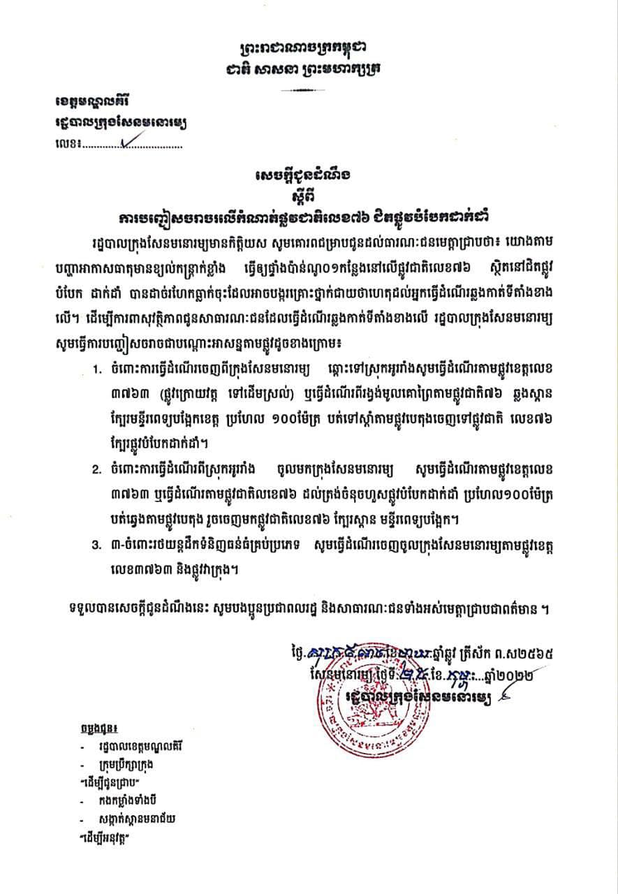 រដ្ឋបាលក្រុងសែនមនោរម្យមានកិត្តិយស សូមគោរពជម្រាបជូនដល់សាធារណៈជនមេត្តាជ្រាបថា៖ យោងតាមបញ្ហាអាកាសធាតុមានខ្យល់កន្ត្រាក់ខ្លាំង ធ្វើឲ្យផ្ទាំងប៉ាន់ណូ ០១កន្លែងនៅលើផ្លូវជាតិលេខ៧៦ ស្ថិតនៅជិតផ្លូវបំបែកដាក់ដាំ បានដាច់រហែកធ្លាក់ចុះដែលអាចបង្កគ្រោះថ្នាក់ជាយថាហេតុដល់អ្នកធ្វើដំណើរឆ្លងកាត់ទីតាំងខាងលើ។ ដើម្បីការពារសុវត្ថិភាពជូនសាធារណជន ដែលធ្វើដំណើរឆ្លងកាត់ទីតាំងខាងលើ រដ្ឋបាលក្រុងសែនមនោរម្យ សូមធ្វើការបញ្ចៀសចរាចរជាបណ្ដោះអាសន្នតាមផ្លូវដូចខាងក្រោម៖