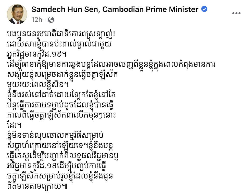 «បងប្អូនជនរួមជាតិជាទីគោរពស្រឡាញ់! ដោយសារខ្ញុំបានប៉ះពាល់ផ្ទាល់ជាមួយអ្នកវិជ្ជមានកូវីដ.១៩។ ដើម្បីធានាកុំឱ្យមានការឆ្លងបន្តដែលអាចចេញពីខ្លួនខ្ញុំក្នុងពេលកំពុងមានការសង្ស័យ ខ្ញុំសម្រេចដាក់ខ្លួនធ្វើចត្តាឡីស័កមួយរយ:ពេលខ្លីសិន។ ខ្ញុំនឹងរស់នៅដាច់ដោយឡែក តែខ្ញុំនៅតែបន្តធ្វើការតាមទម្លាប់ដូចដែលខ្ញុំបានធ្វើកាលពីធ្វើចត្តាឡីស័ក៣លើកមុនៗនោះដែរ។ ខ្ញុំមិនទាន់លុបចោលកម្មវិធីសម្រាប់សប្តាហ៍ក្រោយនៅឡើយទេ។ ខ្ញុំនឹងបន្តធ្វើតេស្ត ដើម្បីបញ្ជាក់ពីលទ្ធផលវិជ្ជមានឬអវិជ្ជមានកូវីដ.១៩ ដើម្បីបញ្ចប់ការធ្វើចត្តាឡីស័កសម្រាប់រូបខ្ញុំដែលខ្ញុំនឹងជូនព័ត៌មានតាមក្រោយ»៕