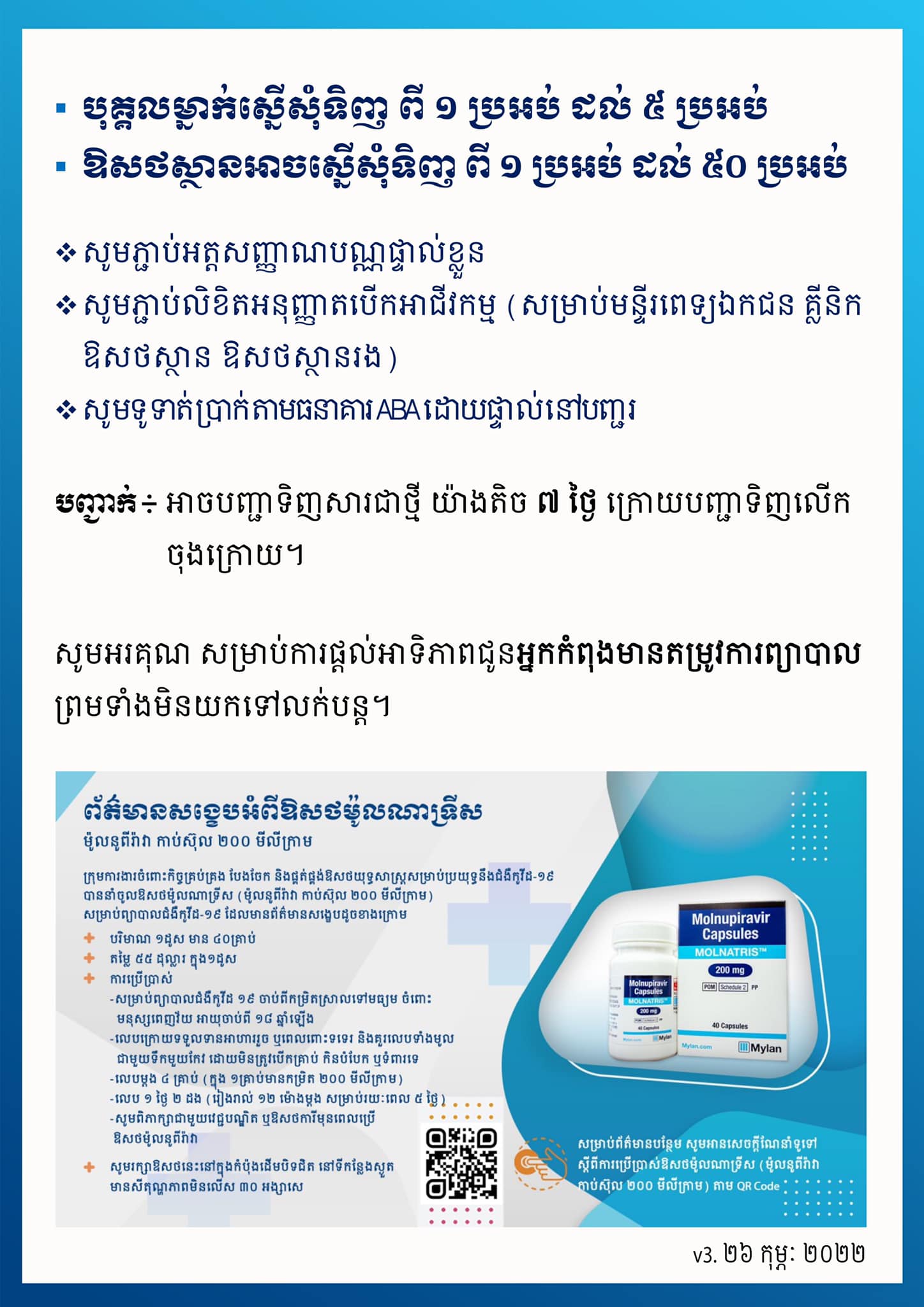 មុននេះបន្តិចក្រសួងប្រៃសណីយ៍ និងទូរគមនាគមន៍ បានប្រកាសនៅលើទំព័រហ្វេសបុកឲ្យដឹងថា៖ ចាប់ពីថ្ងៃទី២៨ កុម្ភៈ ឆ្នាំ២០២២ តទៅ បុគ្គលម្នាក់អាចស្នើសុំទិញឱសថម៉ូលណាទ្រីស ពី ១ ប្រអប់ ដល់ ៥ ប្រអប់ ហើយមន្ទីរពេទ្យឯកជន គ្លីនិក ឱសថស្ថាន ឱសថស្ថានរងអាចស្នើសុំទិញ ពី ១ ប្រអប់ ដល់ ៥០ ប្រអប់។