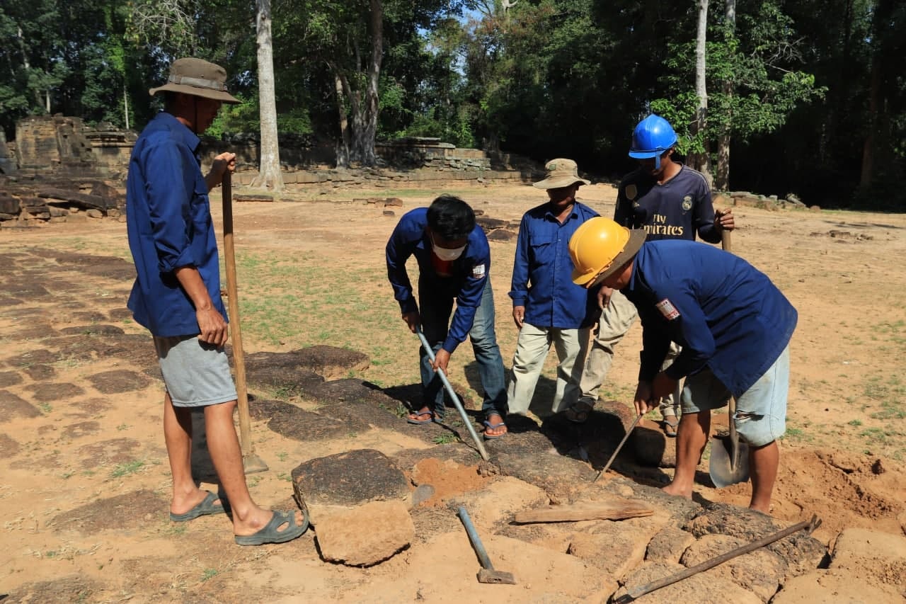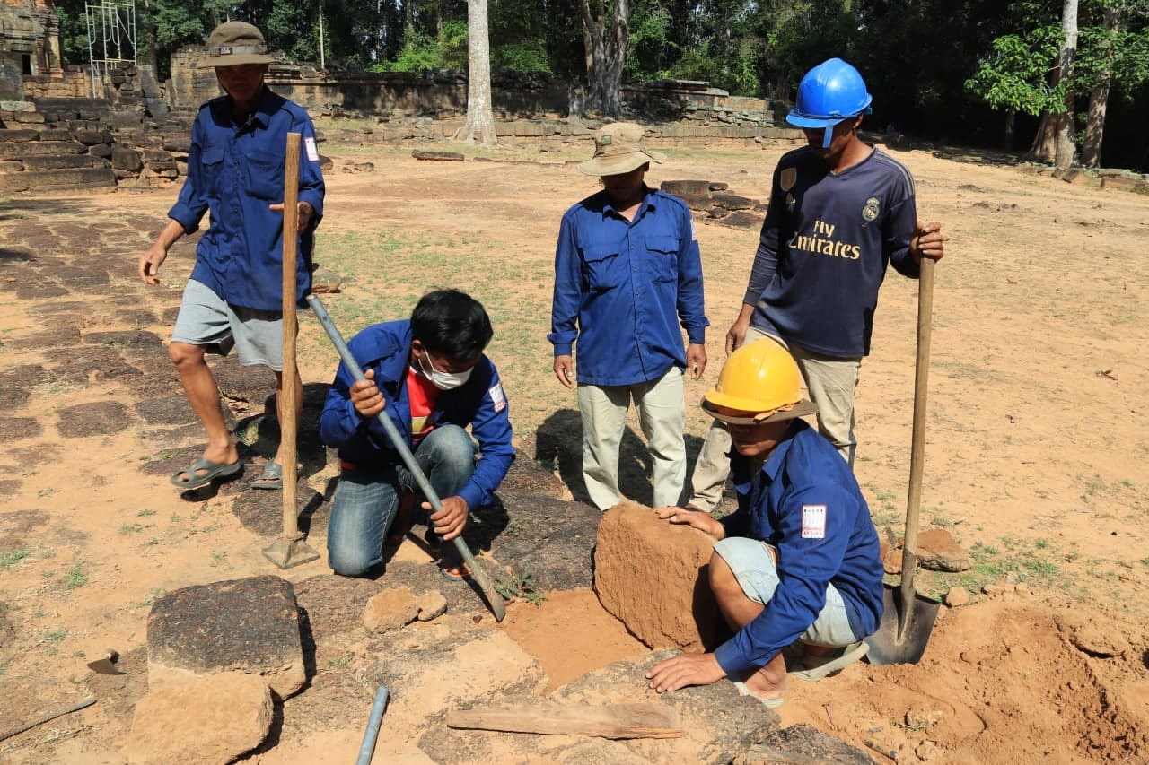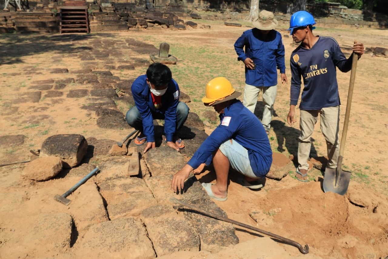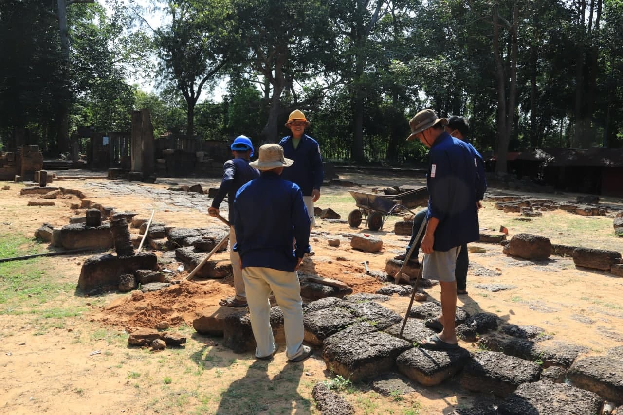 ក្រុមអ្នកបច្ចេកទេសអាជ្ញាធរជាតិអប្សរា ធ្វើការជួសជុលកម្រាលផ្លូវចូលប្រាសាទព្រះគោ