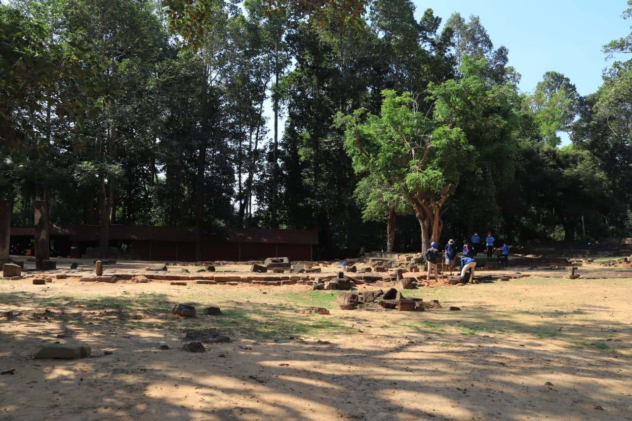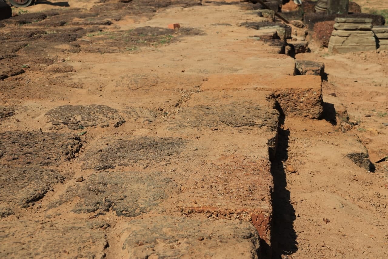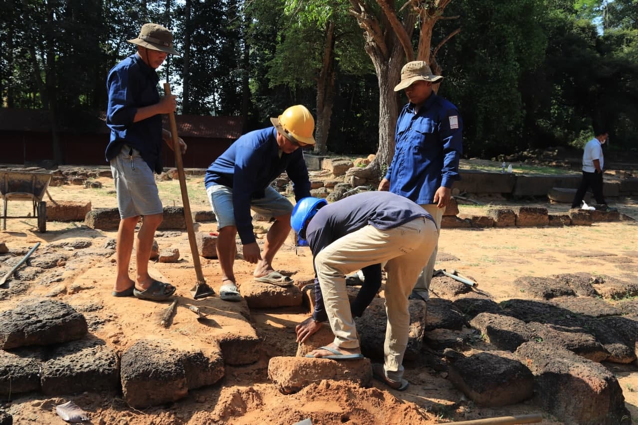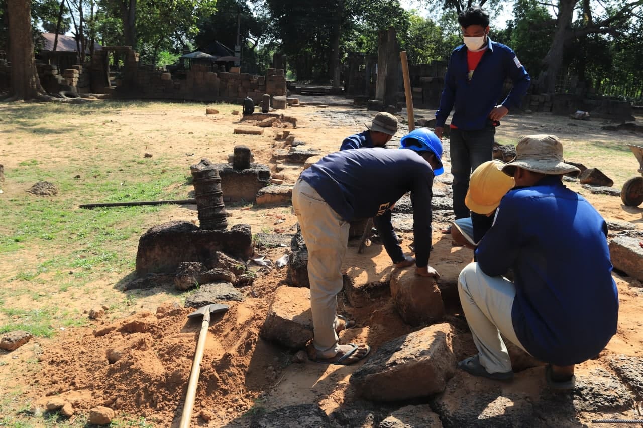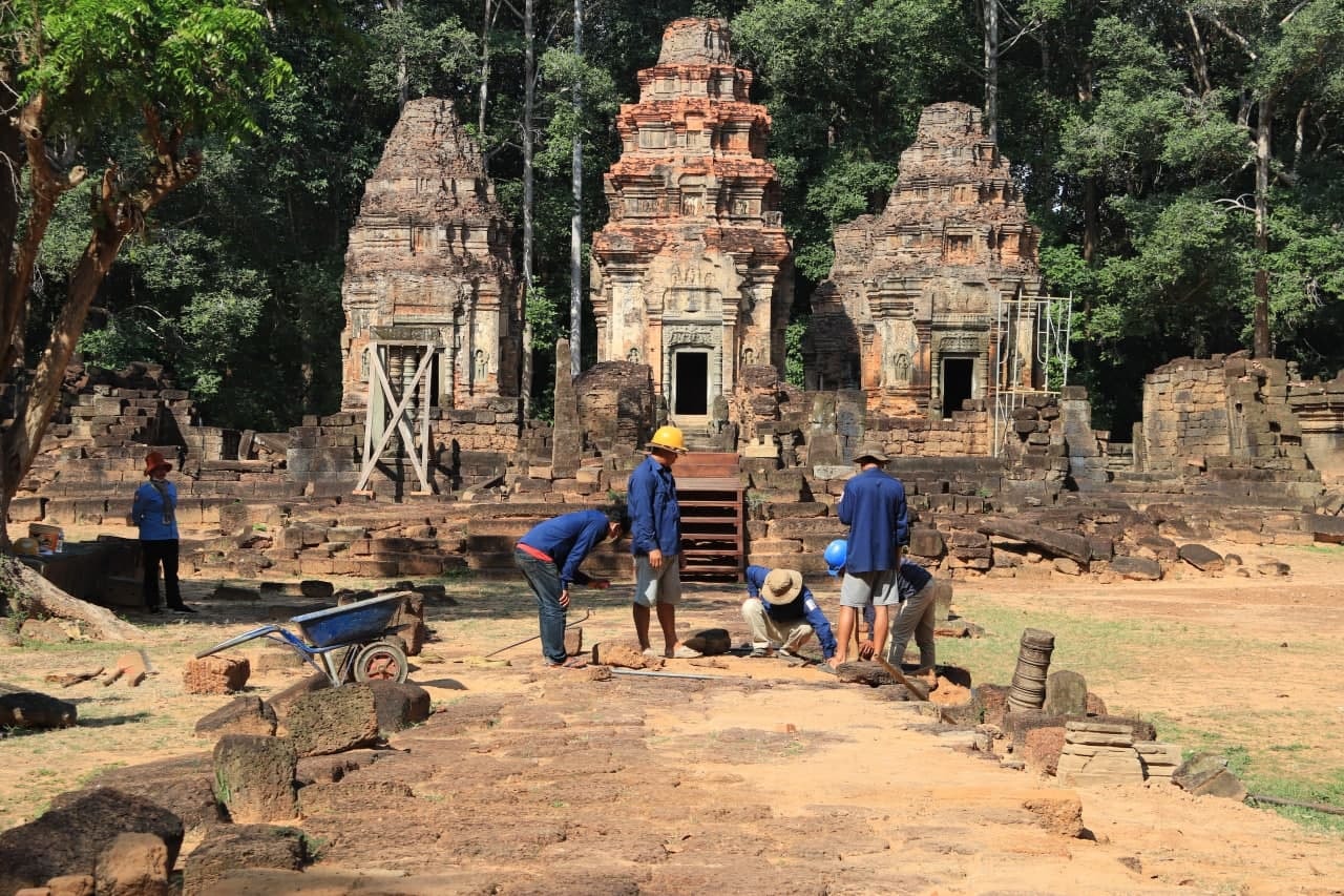 ក្រុមអ្នកបច្ចេកទេសអាជ្ញាធរជាតិអប្សរា ធ្វើការជួសជុលកម្រាលផ្លូវចូលប្រាសាទព្រះគោ