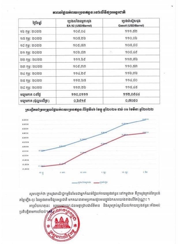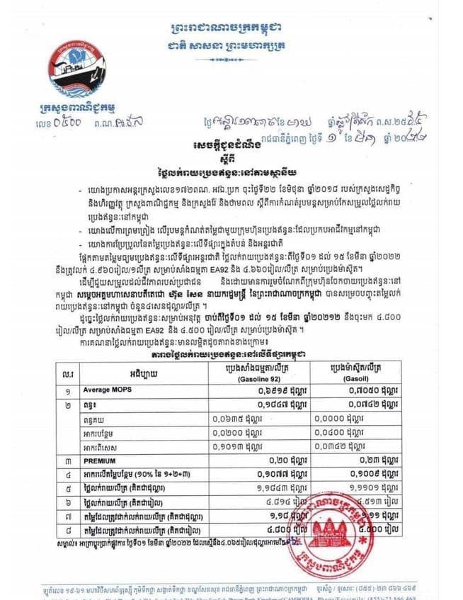 រាជធានីភ្នំពេញ៖ យោងតាមលិខិតរបស់ក្រសួងពាណិជ្ជកម្ម ចុះផ្សាយថ្ងៃទី០១ ខែមីនា ឆ្នាំ២០២២ ស្តីអំពីតម្លៃលក់រាយប្រេងឥន្ធនៈនៅតាមស្ថានីយទាំងអស់ក្នុងព្រះរាជាណាចក្រកម្ពុជាសម្រាប់អនុវត្តទៅតាមតម្លៃមធ្យមប្រេងឥន្ធនៈលើទីផ្សារអន្តរជាតិ ចាប់ពីថ្ងៃទី០១ ដល់ថ្ងៃទី១៥ ខែមីនា ឆ្នាំ២០២២ បានឲ្យដឹងថា តម្លៃប្រេងសាំងធម្មតាមានតម្លៃ ៤,៨០០រៀលក្នុងមួយលីត្រ ចំណែកឯប្រេងសាំងម៉ាស៊ូតមានតម្លៃ ៤,៥០០រៀលក្នុងមួយលីត្រប៉ុណ្ណោះ។