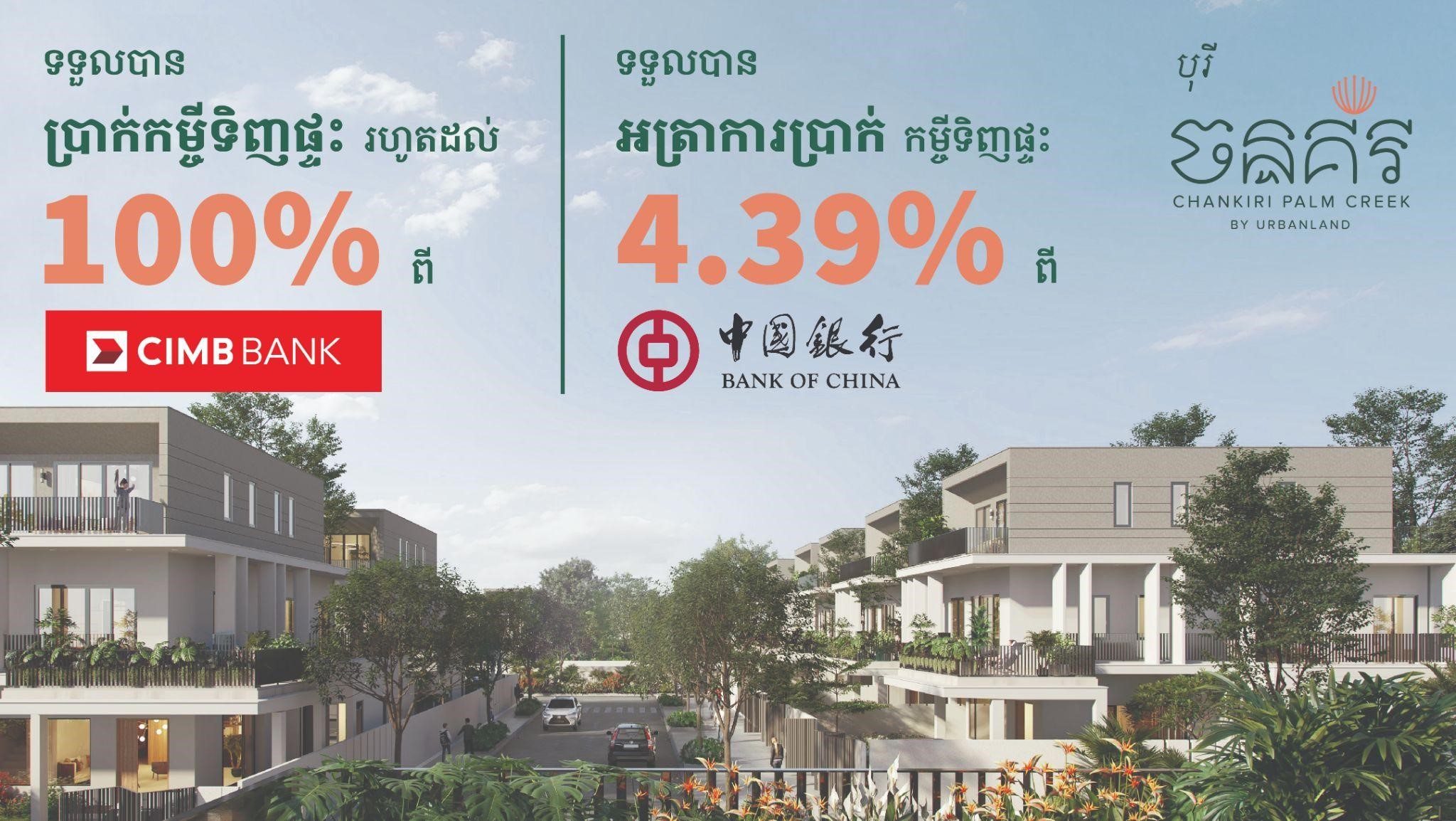 ក្រុមហ៊ុនអឺបេនលែន (Urbanland) បន្តចាប់ដៃគូជាមួយធនាគារដើម្បីផ្តល់ប្រាក់កម្ចីទិញផ្ទះដែល មានតម្លៃដល់ទៅ 100% និងអត្រាការប្រាក់កាន់តែប្រសើររហូតដល់ 4.39%