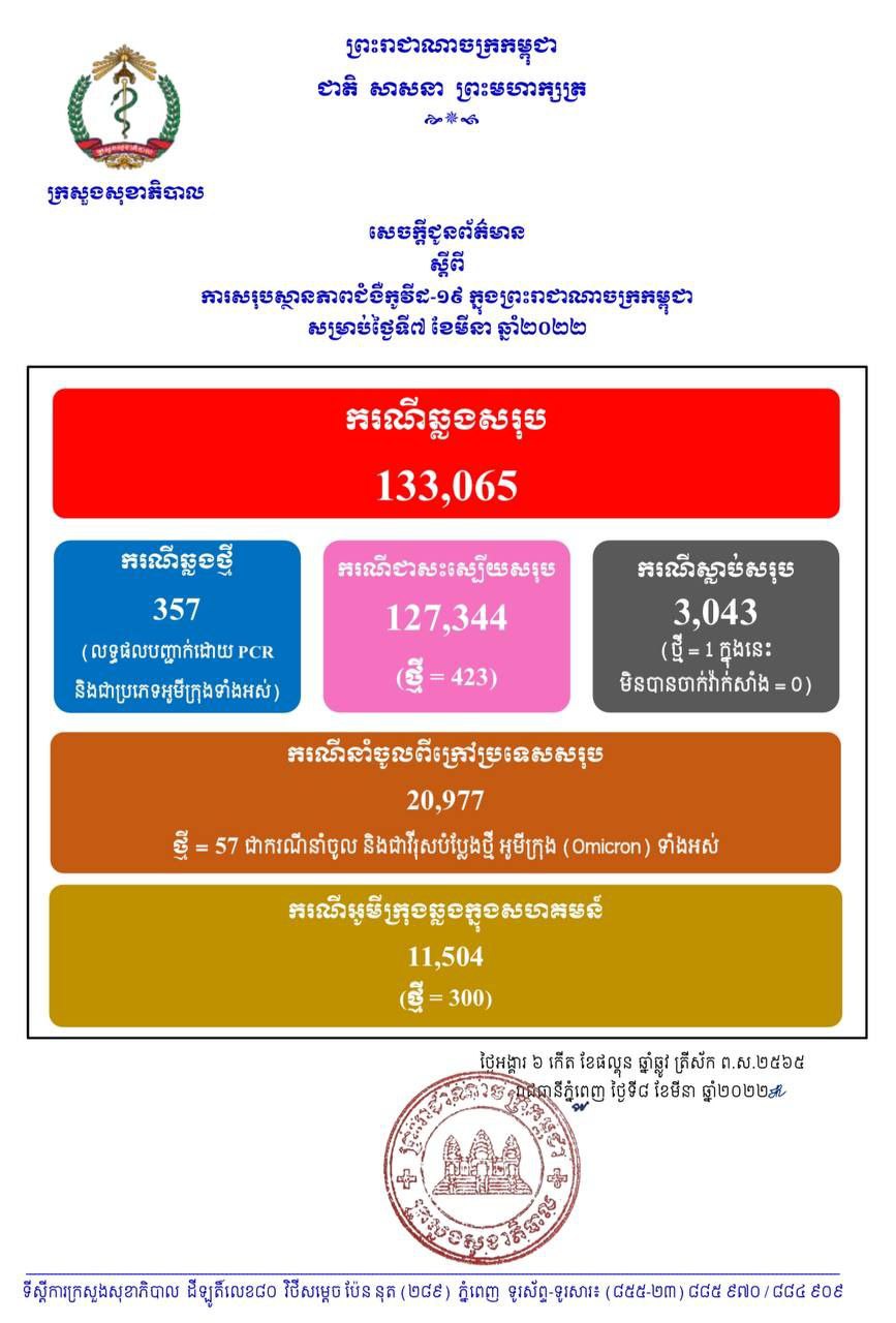 នៅថ្ងៃទី08 ខែមីនា ឆ្នាំ2022នេះ ក្រសួងសុខាភិបាលកម្ពុជា បានចេញសេចក្តីជូនដំណឹងពី ការរកឃើញករណីវិជ្ជមានវីរុសកូវីដ១៩ថ្មី ចំនួន 357នាក់ (លទ្ធផលបញ្ជាក់ដោយ PCR នឹងជាប្រភេទអូមីក្រុងទាំងអស់) ក្នុងនោះករណីឆ្លងសហគមន៍ 300នាក់ និងករណីនាំចូល 57នាក់ ខណៈអ្នកបានជាសះស្បើយថ្មីមានចំនួន 423នាក់ និងអ្នកបាត់បង់ជីវិតថ្មីចំនួន 01នាក់(ក្នុងនេះមិនបានចាក់វ៉ាក់សាំង 0នាក់) ហើយគិតមកទល់ពេលនេះ ករណីឆ្លងកូវីដ១៩ សរុបនៅក្នុងប្រទេសកម្ពុជា មានចំនួន 133,065 នាក់, ករណីជាសះស្បើយសរុប 127,344 នាក់ និងស្លាប់សរុប 3,043នាក់៕