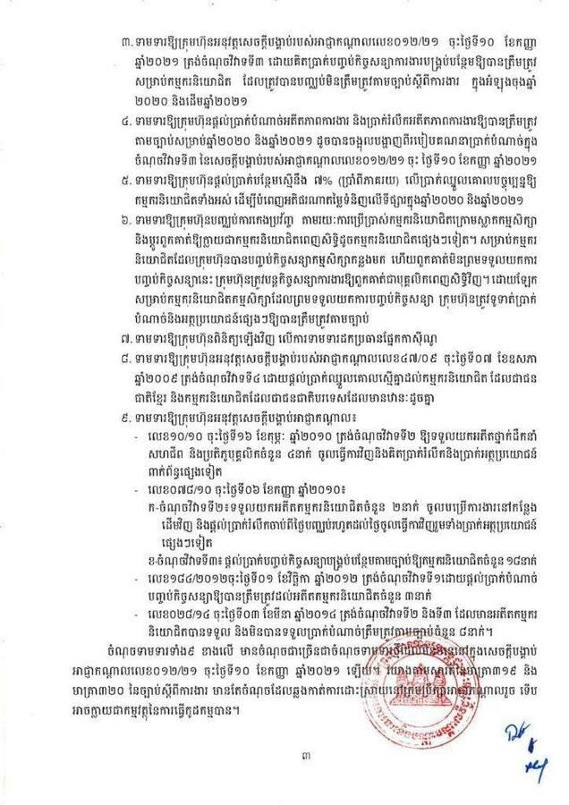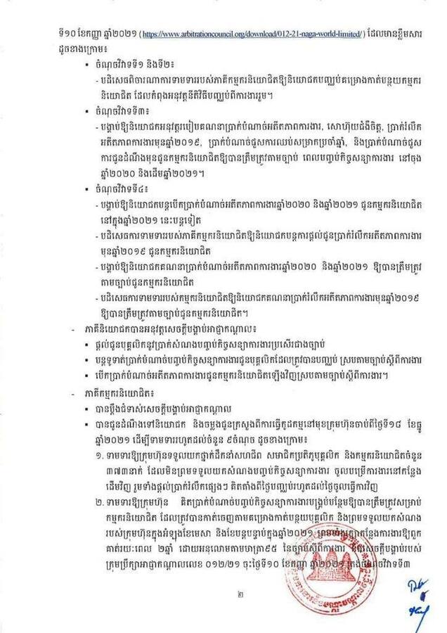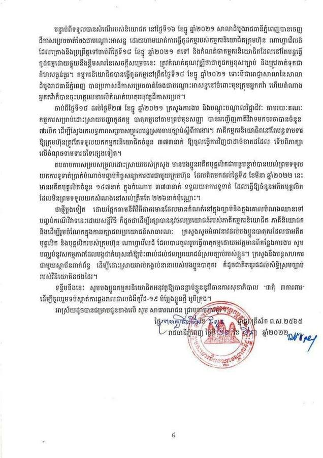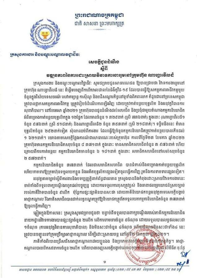 ជាថ្មីម្តងទៀត ដោយផ្អែកតាមនីតិវិធីជាធរមានដែលមានកំណត់នៅក្នុងច្បាប់និងក្នុងគោលបំណងឈានទៅ បញ្ចប់ករណីវិវាទនេះដោយសន្តិវិធី ក៏ដូចជាដើម្បីរក្សាបាននូវផលប្រយោជន៍របស់ភាគីកម្មករនិយោជិត ភាគីនិយោជក និងដើម្បីរួមចំណែកក្នុងការរក្សាផលប្រយោជន៍សាធារណៈ ក្រសួងសូមអំពាវនាវដល់បងប្អូនបាតុករដែលជាអតីតបុគ្គលិក និងបុគ្គលិករបស់ក្រុមហ៊ុន ណាហ្គាវើលដ៏ ដែលបានចូលរួមធ្វើបាតុកម្មដោយអវត្តមានពីកន្លែងការងារ សូមបញ្ឈប់នូវសកម្មភាពដែលបង្កជាកំហុសនាំឲ្យប៉ះពាល់ដល់ផលប្រយោជន៍ស្របច្បាប់របស់ខ្លួន។ ក្រសួងនឹងបន្តសហការ ជាមួយស្ថាប័នពាក់ព័ន្ធ ដើម្បីដោះស្រាយរាល់កង្វល់នានារបស់បងប្អូនបាតុករ ក៏ដូចជាគិតគូរផ្ដល់សិទ្ធិស្របច្បាប់របស់វិនិយោគិនផងដែរ៕