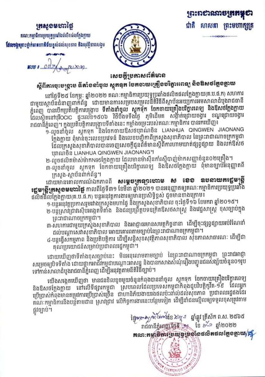 រាជធានីភ្នំពេញ៖ យោងតាមការចុះផ្សាយរបស់ គណៈកម្មាធិការប្រយុទ្ធប្រឆាំងផលិតផលក្លែងក្លាយ នៅថ្ងៃទី១១ ខែមីនា ឆ្នាំ២០២២ បានចេញសេចក្តីប្រកាសព័ត៌មាន ស្តីពីការចុះបង្ក្រាបទីតាំងនាំចូល ស្តុកទុក ចែកចាយគ្រឿងបរិក្ខាពេទ្យ និងឱសថក្លែងក្លាយពីសំណាក់ក្រុមប្រតិបត្តិការចម្រុះនៃគណៈកម្មាធិការប្រយុទ្ធប្រឆាំងផលិតផលក្លែងក្លាយ ដោយមានការសម្របសម្រួលនិតិវិធីពីស្ថាប័នអយ្យការអមសាលាដំបូងរាជធានីភ្នំពេញ កាលពីថ្ងៃទី២៥ ខែកុម្ភៈ ឆ្នាំ២០២២ នៅបុរីOCIC ផ្ទះលេខ១៥០៦ វិថីបឹងទទឹងថ្ងៃ ភូមិដើមគ សង្កាត់ជ្រោយចង្វារ ខណ្ឌជ្រោយចង្វារ រាជធានីភ្នំពេញ ។