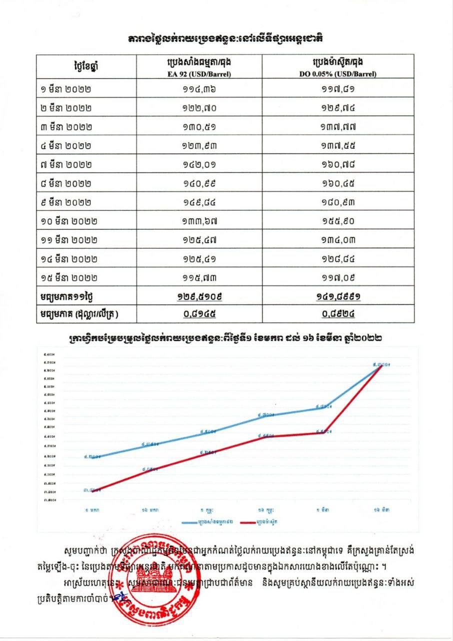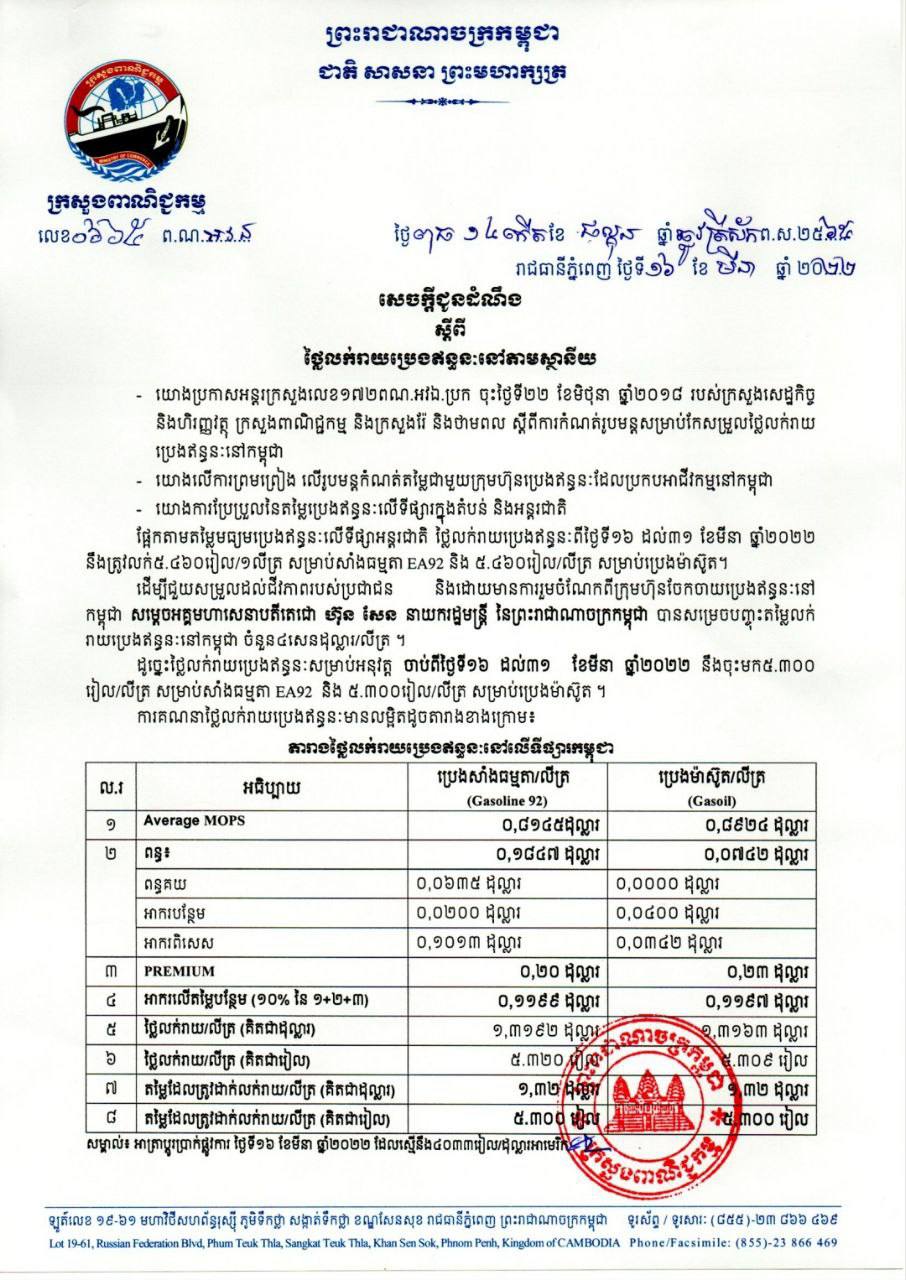 រាជធានីភ្នំពេញ៖ យោងតាមលិខិតរបស់ក្រសួងពាណិជ្ជកម្ម ចុះផ្សាយថ្ងៃទី១៦ ខែមីនា ឆ្នាំ២០២២ ស្តីអំពីតម្លៃលក់រាយប្រេងឥន្ធនៈនៅតាមស្ថានីយទាំងអស់ក្នុងព្រះរាជាណាចក្រកម្ពុជាសម្រាប់អនុវត្តទៅតាមតម្លៃមធ្យមប្រេងឥន្ធនៈលើទីផ្សារអន្តរជាតិ ចាប់ពីថ្ងៃទី១៦ ដល់ថ្ងៃទី៣១ ខែមីនា ឆ្នាំ២០២២ បានឲ្យដឹងថា តម្លៃប្រេងសាំងធម្មតាមានតម្លៃ ៥,៣០០រៀលក្នុងមួយលីត្រ ចំណែកឯប្រេងសាំងម៉ាស៊ូតមានតម្លៃ ៥,៣០០រៀលក្នុងមួយលីត្រប៉ុណ្ណោះ។
