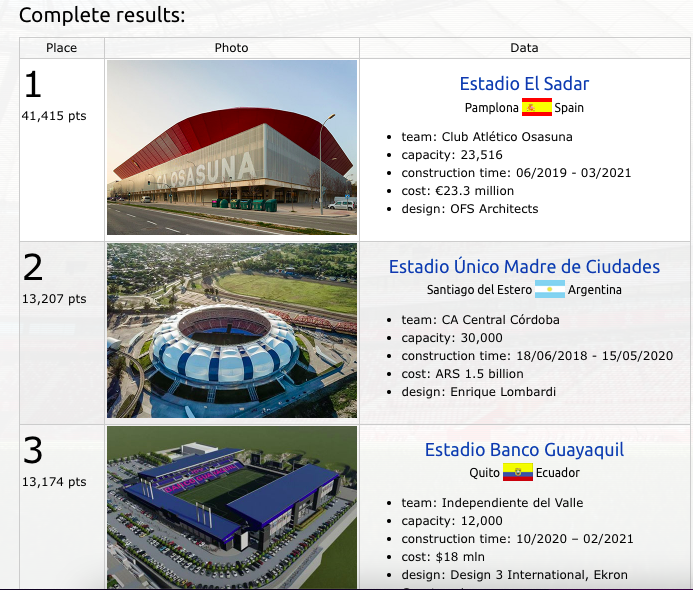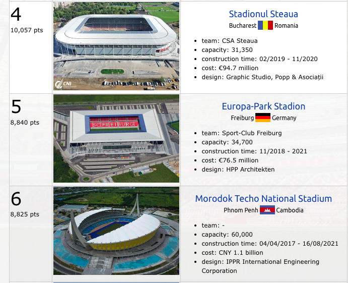 បើតាមការបោះឆ្នោតនៅលើគេហទំព័រ StadiumDB បានបង្ហាញថា ពហុកីឡដ្ឋានជាតិមរតកតេជោ (Morodok Techo National Stadium) របស់ប្រទេសកម្ពុជា បានជាប់ចំណាត់ថ្នាក់លេខ៦ ជាកីឡដ្ឋានល្អបំផុតប្រចាំឆ្នាំ២០២១ ឬ Stadium of the Year 2021 នៅក្នុងការបោះឆ្នោតជំនាន់១២ របស់ខ្លួន។ វាគឺជាការស្ទង់មតិបើកចំហដ៏ធំ និងយូរអង្វែងបំផុត ហើយសម្រាប់ឆ្នាំនេះផ្ទាល់ គិតត្រឹមថ្ងៃទី១៤ ខែមីនា ឆ្នាំ២០២២ មានសំឡេងបោះឆ្នោះចំនួន ១២ ៨៧៣ ត្រូវបានរាប់បញ្ចូលជាផ្លូរការ។