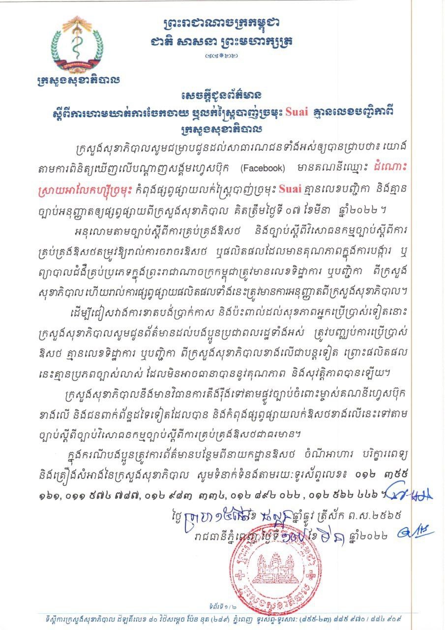 រាជធានីភ្នំពេញ៖ យោងតាមការចុះផ្សាយរបស់ ក្រសួងសុខាភិបាល នៅថ្ងៃទី១៨ ខែមីនា ឆ្នាំ២០២២ បានចេញសេចក្ដីជូនព័ត៌មាន ស្ដីពីការហាមឃាត់ការចែកចាយ ឬលក់ស្ព្រៃបាញ់ច្រមុះ Suai គ្មានលេខបញ្ជិកាពីក្រសួងសុខាភិបាល។