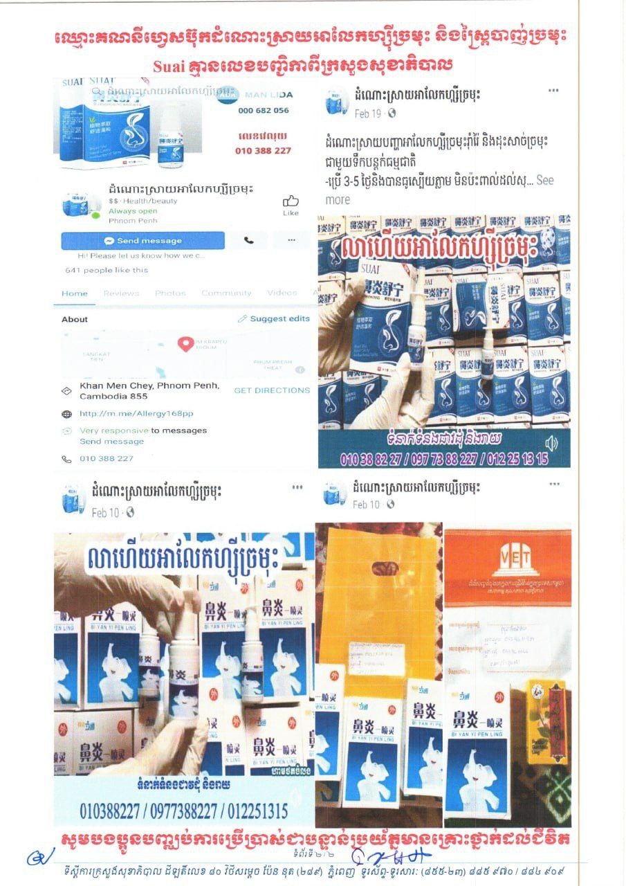 យោងតាមការពិនិត្យលើបណ្ដាញសង្គមហ្វេស ប៊ុក មានគណនីឈ្មោះ ដំណោះស្រាយអាលែកហ្ស៊ីច្រមុះ បានកំពុងផ្សព្វផ្សាយលក់ស្ព្រៃបាញ់ច្រមុះ Suai គ្មានលេខបញ្ជិកា និងគ្មានច្បាប់អនុញ្ញាតឲ្យផ្សព្វផ្សាយពីក្រសួងសុខាភិបាល គិតត្រឹមថ្ងៃទី០៧ ខែមីនា ឆ្នាំ២០២២។